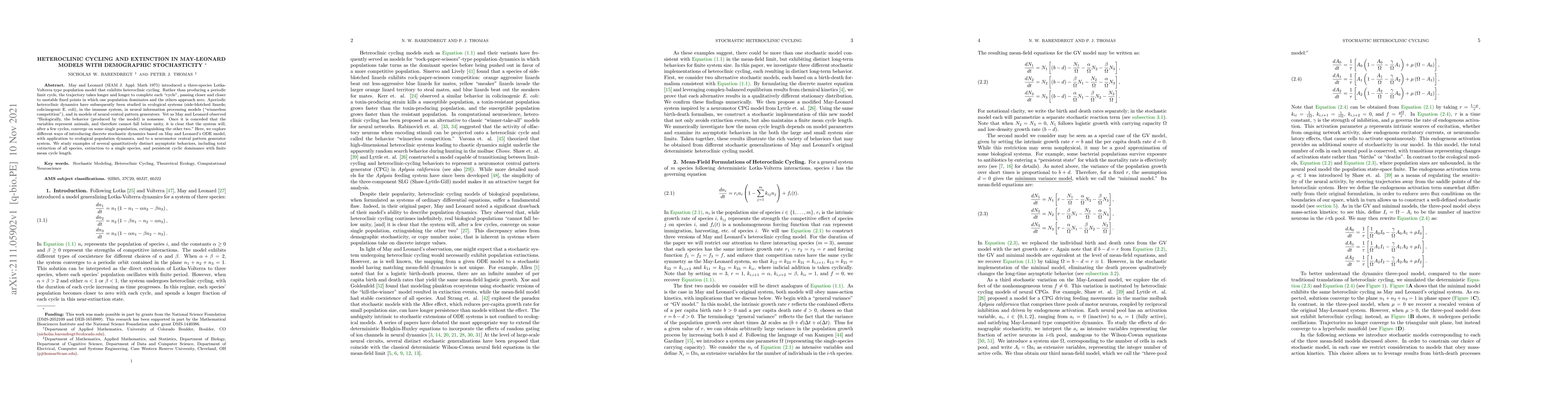 This paper explores the introduction of demographic stochasticity into May-Leonard's three-species model, revealing various asymptotic behaviors such as extinction of all species or extinction to a single species, alongside persistent cyclic dominance. The study highlights the model's relevance to ecological and neuromotor systems.