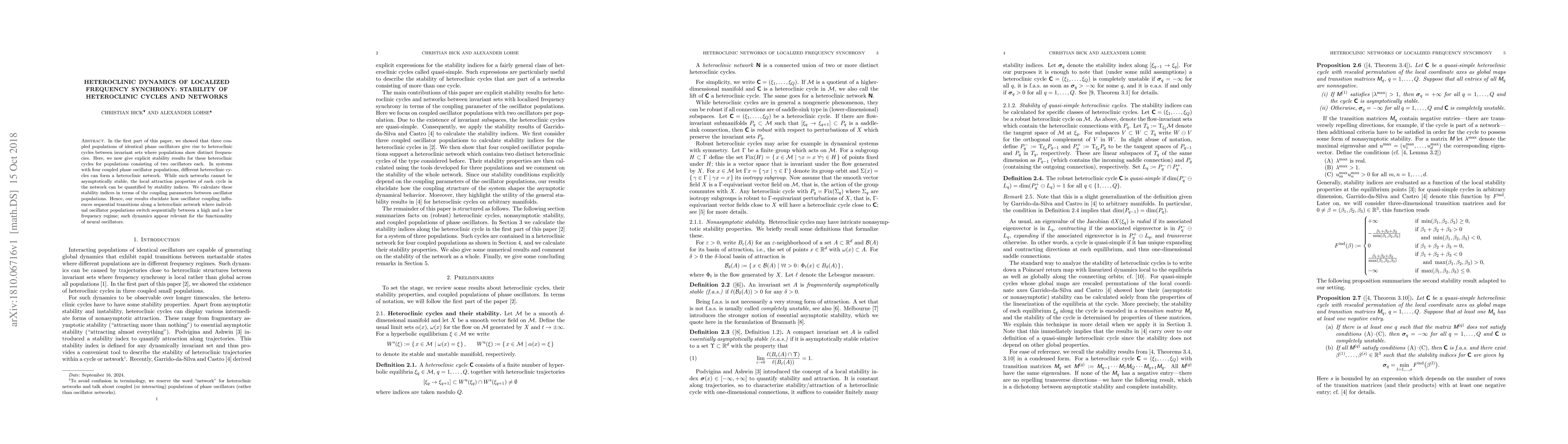 This paper investigates the stability of heteroclinic cycles and networks formed by coupled phase oscillators, demonstrating how coupling parameters influence the sequential transitions between high and low frequency regimes in neural oscillators. Stability indices quantify the local attraction properties of each cycle within the network, providing insights into the dynamics of localized frequency synchrony.