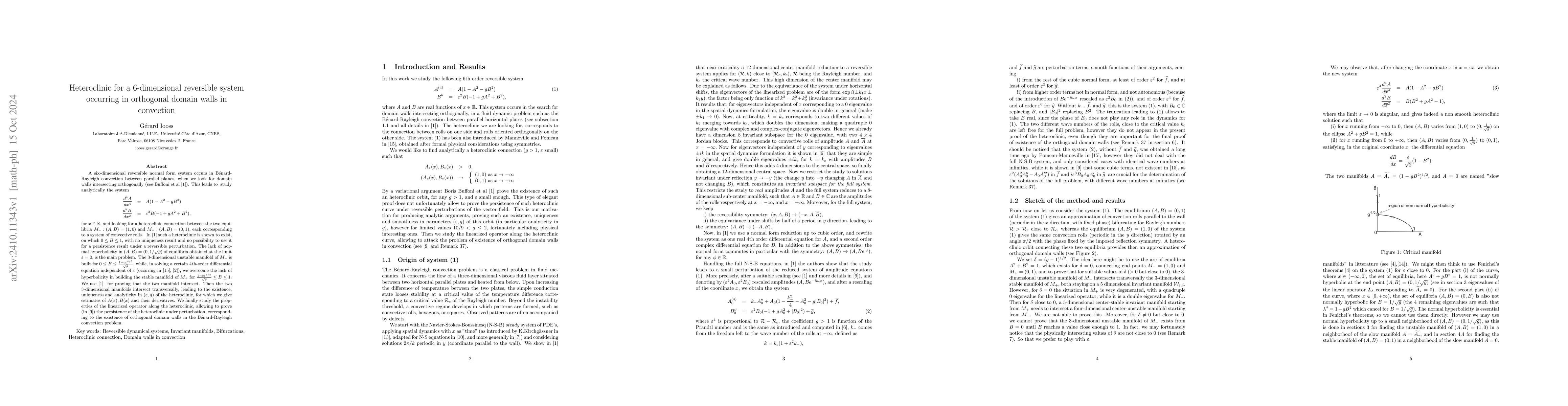 Summary: This paper proves the existence and local uniqueness of a heteroclinic connection in a six-dimensional reversible system arising from Bénard-Rayleigh convection with orthogonal domain walls. It establishes transversal intersections of unstable and stable manifolds on a five-dimensional invariant manifold, and discusses the persistence of this heteroclinic connection under reversible perturbations.