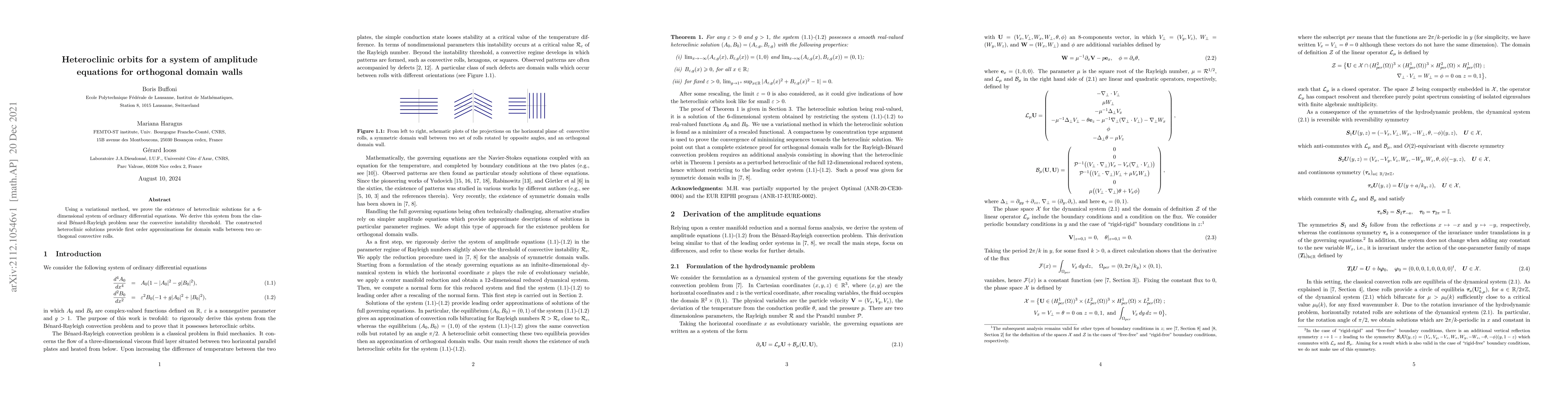 Using a variational method, we prove the existence of heteroclinic solutions for a 6dimensional system of ordinary differential equations. We derive this system from the classical B{\'e}nard-Rayleigh problem near the convective instability threshold. The constructed heteroclinic solutions provide first order approximations for domain walls between two orthogonal convective rolls.
