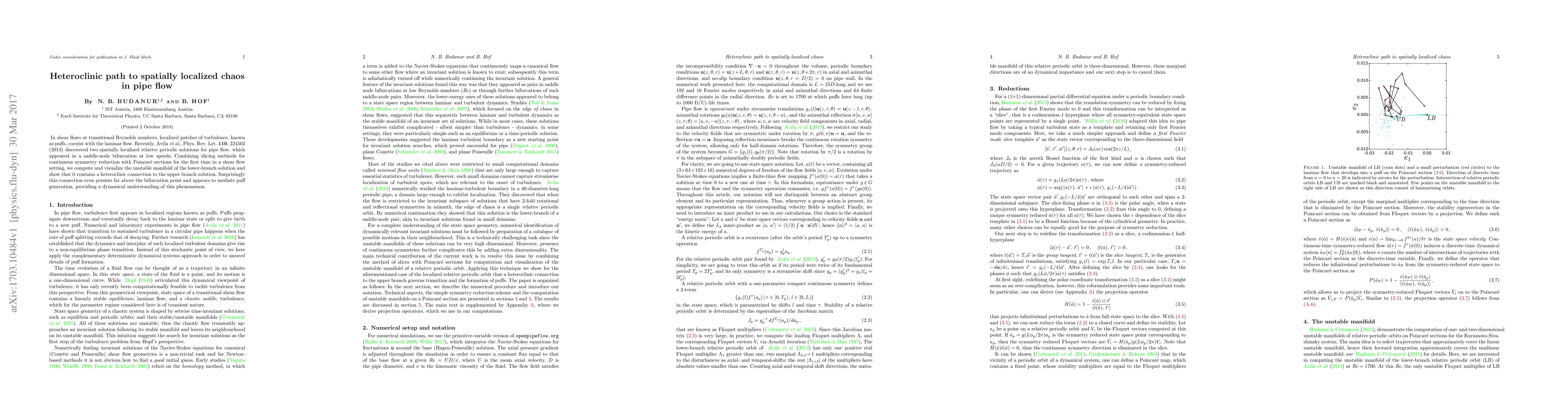 This paper investigates the emergence of localized turbulence (puffs) in transitional pipe flow, revealing a heteroclinic path linking two spatially localized relative periodic solutions. The study combines symmetry reduction and Poincaré sections to demonstrate that this heteroclinic connection persists beyond bifurcation points and likely mediates the generation of puffs, offering new insights into the dynamics of turbulence.