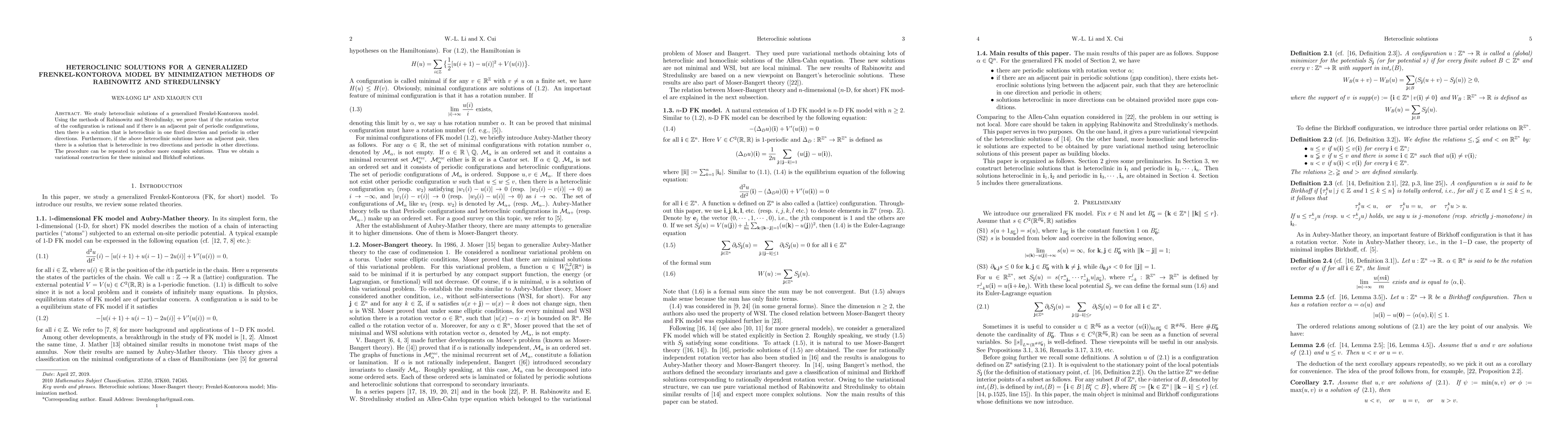 This paper investigates heteroclinic solutions in a generalized Frenkel-Kontorova model using Rabinowitz and Stredulinsky's minimization methods. It proves the existence of heteroclinic solutions that are periodic in all but one or two directions, depending on the configuration's rotation vector and the presence of adjacent periodic configurations.