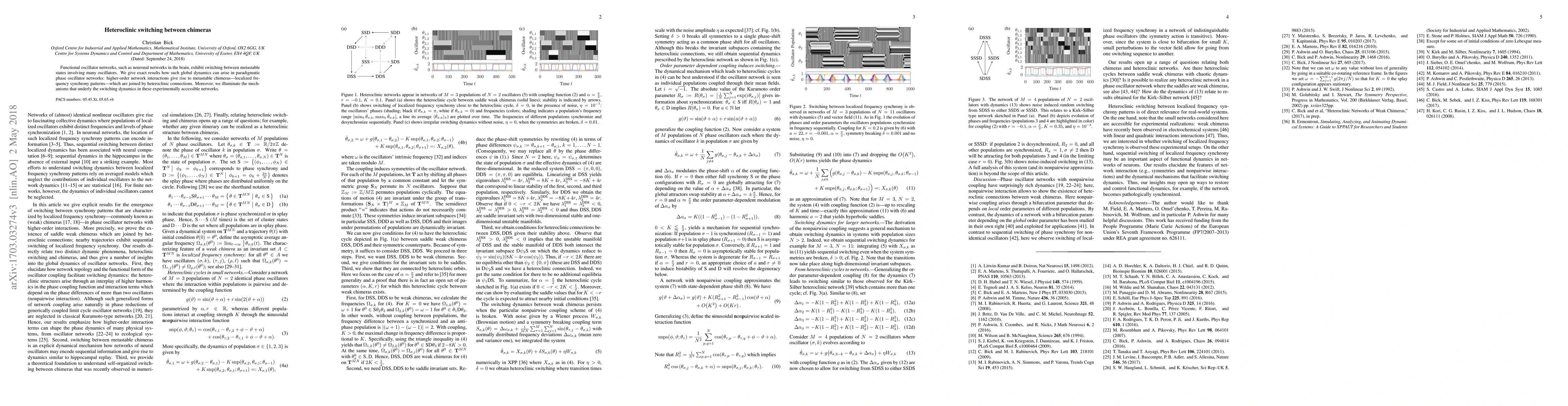 Functional oscillator networks, such as neuronal networks in the brain, exhibit switching between metastable states involving many oscillators. We give exact results how such global dynamics can arise in paradigmatic phase oscillator networks: higher-order network interaction gives rise to metastable chimeras - localized frequency synchrony patterns - which are joined by heteroclinic connections. Moreover, we illuminate the mechanisms that underly the switching dynamics in these experimentally accessible networks.
