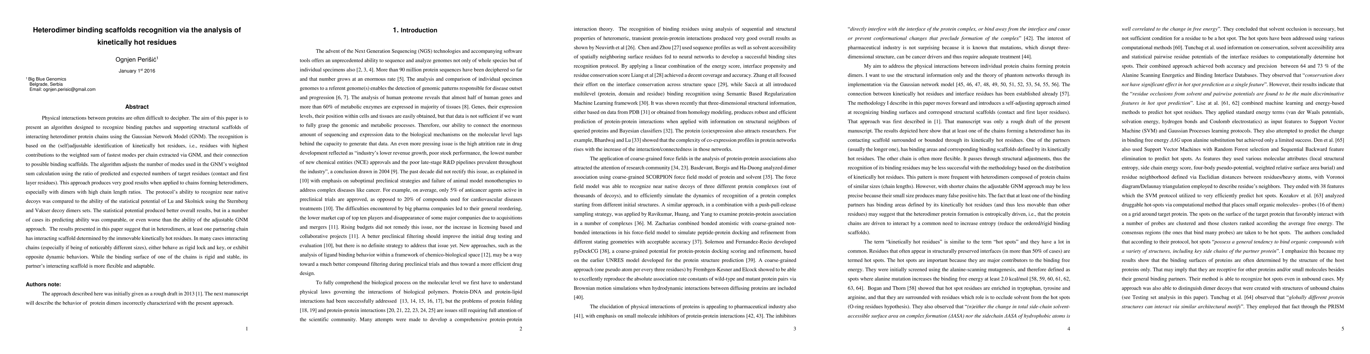 Physical interactions between proteins are often difficult to decipher. The aim of this paper is to present an algorithm designed to recognize binding patches and supporting structural scaffolds of interacting heterodimer protein chains using the Gaussian Network Model (GNM). The recognition is based on the (self)adjustable identification of kinetically hot residues, i.e., residues with highest contributions to the weighted sum of fastest modes per chain extracted via GNM, and their connection to possible binding scaffolds. The algorithm adjusts the number of modes used in the GNM's weighted sum calculation using the ratio of predicted and expected numbers of target residues (contact and first layer residues). This approach produces very good results when applied to chains forming heterodimers, especially with dimers with high chain length ratios. The protocol's ability to recognize near native decoys was compared to the ability of the statistical potential of Lu and Skolnick using the Sternberg and Vakser decoy dimers sets. The statistical potential produced better overall results, but in a number of cases its predicting ability was comparable, or even worse than the ability of the adjustable GNM approach. The results presented in this paper suggest that in heterodimers, at least one partnering chain has interacting scaffold determined by the immovable kinetically hot residues. In many cases interacting chains (especially if being of noticeably different sizes), either behave as rigid lock and key, or exhibit opposite dynamic behaviors. While the binding surface of one of the chains is rigid and stable, its partner's interacting scaffold is more flexible and adaptable. Authors note: The approach described here was initially given as a rough draft in 2013 [1]. The next manuscript will describe the behavior of protein dimers incorrectly characterized with the present approach.