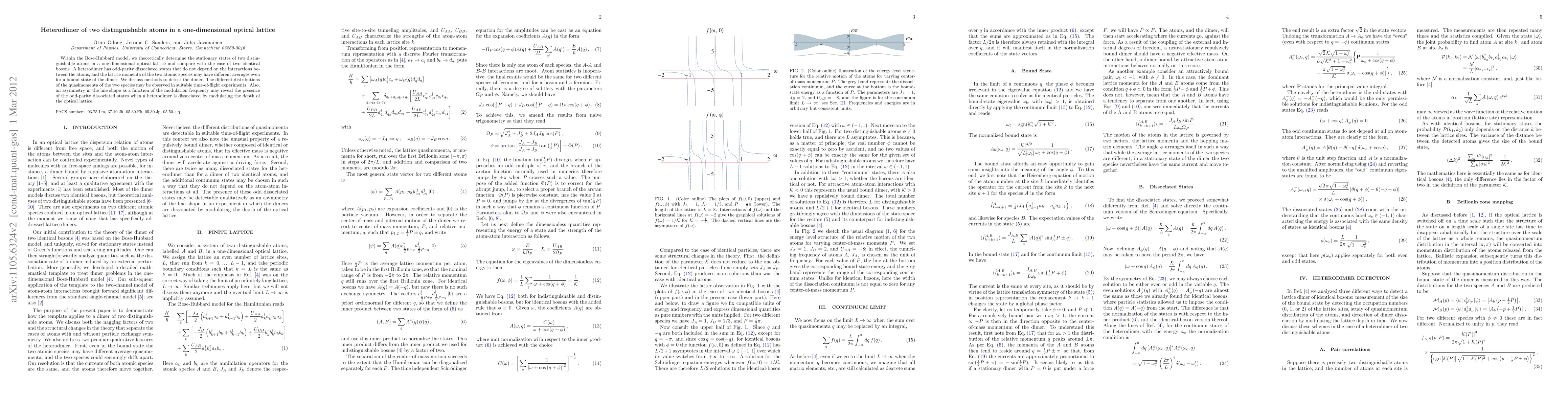 This paper theoretically investigates the stationary states of two distinguishable atoms in a one-dimensional optical lattice using the Bose-Hubbard model, revealing heterodimer odd-parity dissociated states unaffected by atom interactions. It proposes methods for detecting these heterodimers, including observing different quasimomentum distributions and detecting line shape asymmetries via modulation frequency changes.