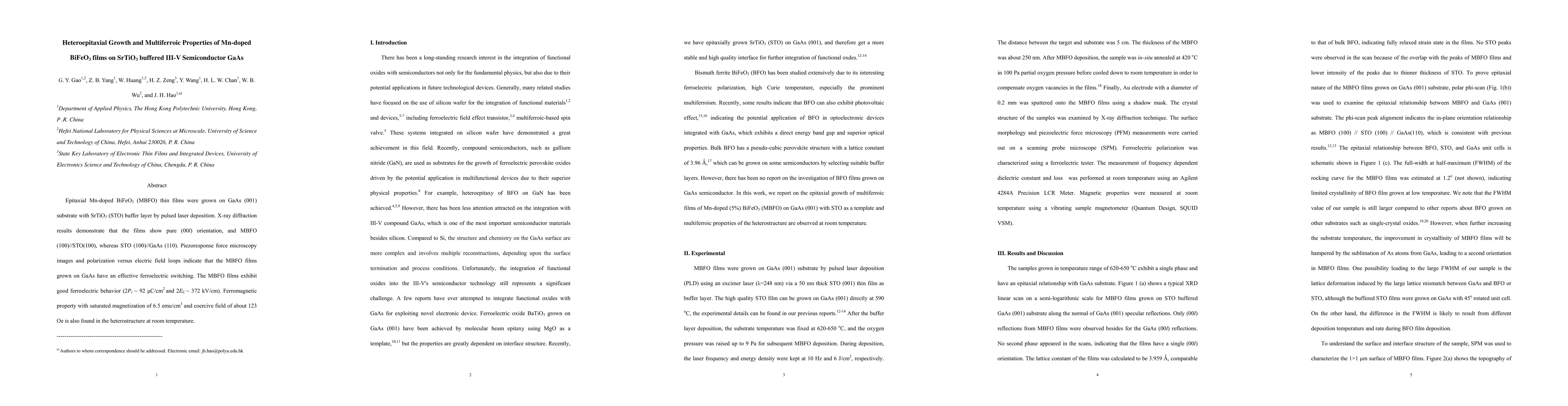 This study explores the heteroepitaxial growth of Mn-doped BiFeO3 (MBFO) thin films on GaAs substrates using SrTiO3 buffer layers, revealing pure (00l) orientation and effective ferroelectric switching. The films exhibit strong ferroelectric behavior and ferromagnetic properties at room temperature.