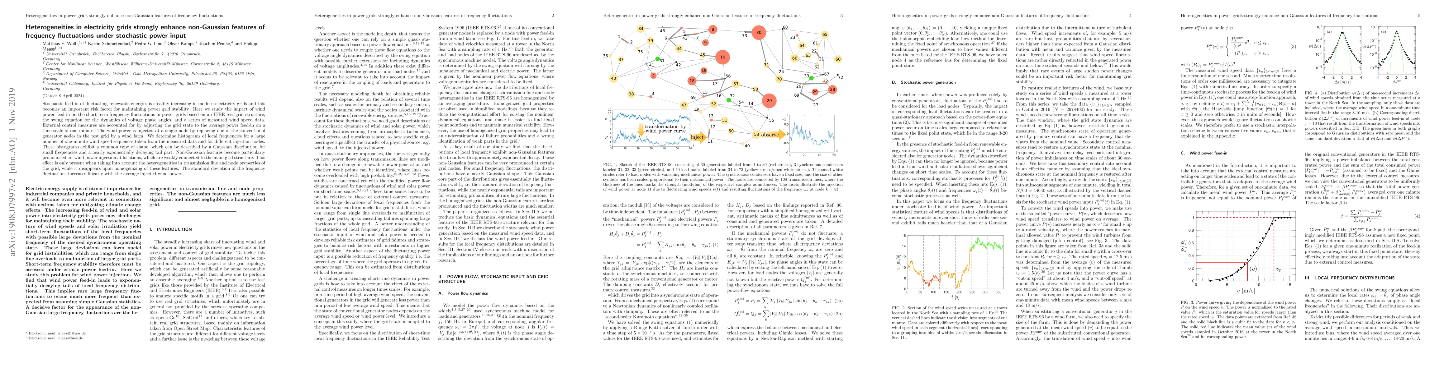 Stochastic feed-in of fluctuating renewable energies is steadily increasing in modern electricity grids and this becomes an important risk factor for maintaining power grid stability. Here we study the impact of wind power feed-in on the short-term frequency fluctuations in power grids based on an IEEE test grid structure, the swing equation for the dynamics of voltage phase angles, and a series of measured wind speed data. External control measures are accounted for by adjusting the grid state to the average power feed-in on a time scale of one minute. The wind power is injected at a single node by replacing one of the conventional generator nodes in the test grid by a wind farm. We determine histograms of local frequencies for a large number of one-minute wind speed sequences taken from the measured data and for different injection nodes. These histograms exhibit a common type of shape, which can be described by a Gaussian distribution for small frequencies and a nearly exponentially decaying tail part. Non-Gaussian features become particularly pronounced for wind power injection at locations, which are weakly connected to the main grid structure. This effect is only present when taking into account the heterogeneities in transmission line and node properties of the grid, while it disappears upon homogenizing of these features. The standard deviation of the frequency fluctuations increases linearly with the average injected wind power.