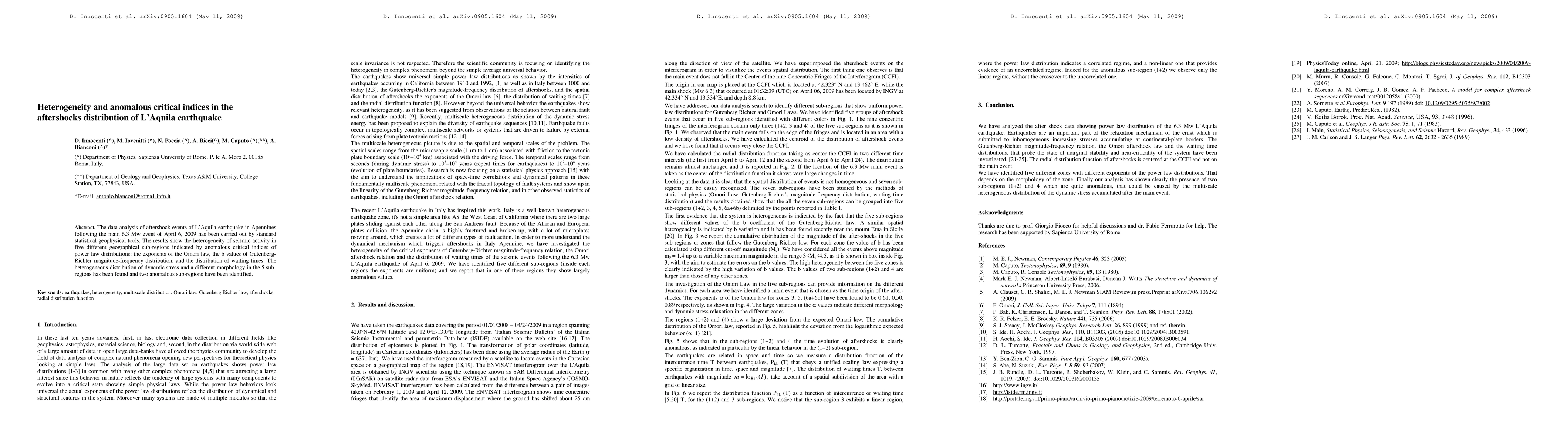 This study analyzes aftershocks following the 2009 L'Aquila earthquake using statistical tools, revealing heterogeneity in seismic activity across five sub-regions characterized by anomalous critical indices. The research identifies two particularly anomalous sub-regions, indicating different dynamic stress distributions and morphologies.