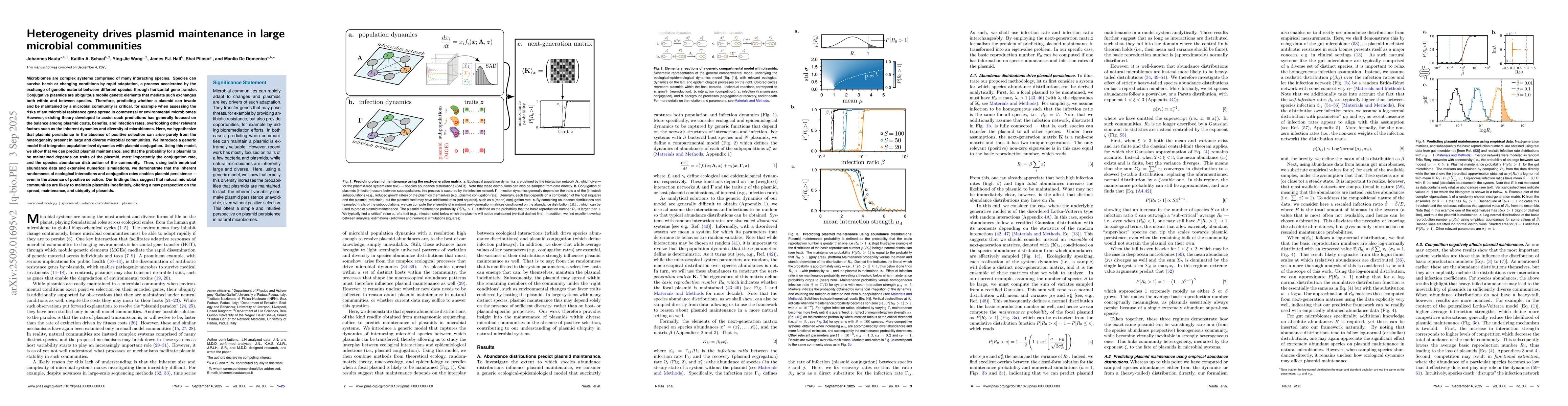 Microbiomes are complex systems comprised of many interacting species. Species can survive harsh or changing conditions by rapid adaptation, a process accelerated by the exchange of genetic material between different species through horizontal gene transfer. Conjugative plasmids are ubiquitous mobile genetic elements that mediate such exchanges both within and between species. Therefore, predicting whether a plasmid can invade and be maintained by a microbial community is critical, for example when assessing the risks of antimicrobial resistance gene spread in commensal or environmental microbiomes. However, existing theory developed to assist such predictions has generally focused on the balance among plasmid costs, benefits, and infection rates, overlooking other relevant factors such as the inherent dynamics and diversity of microbiomes. Here, we hypothesize that plasmid persistence in the absence of positive selection can arise purely from the heterogeneity present in large and diverse microbial communities. We introduce a generic model that integrates population-level dynamics with plasmid conjugation. Using this model, we show that we can predict plasmid maintenance, and that the probability for a plasmid to be maintained depends on traits of the plasmid, most importantly the conjugation rate, and the species abundance distribution of the community. Then, using both empirical abundance data and extensive numerical simulations, we demonstrate that the inherent randomness of ecological interactions and conjugation rates enables plasmid persistence -- even in the absence of positive selection. Our findings thus suggest that natural microbial communities are likely to maintain plasmids indefinitely, offering a new perspective on the spread, maintenance, and ubiquity of plasmids.