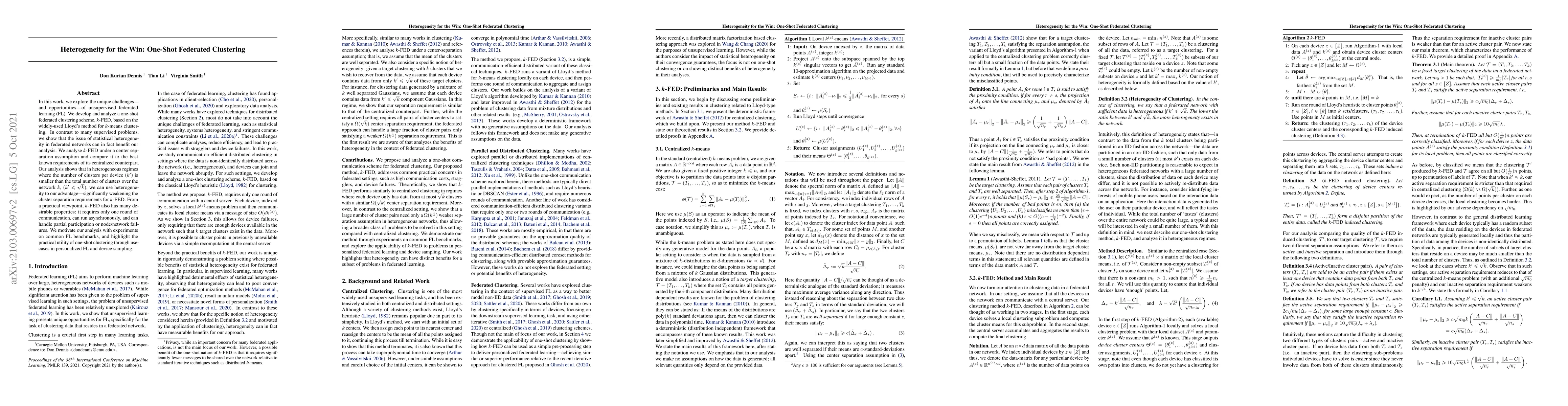 In this work, we explore the unique challenges -- and opportunities -- of unsupervised federated learning (FL). We develop and analyze a one-shot federated clustering scheme, $k$-FED, based on the widely-used Lloyd's method for $k$-means clustering. In contrast to many supervised problems, we show that the issue of statistical heterogeneity in federated networks can in fact benefit our analysis. We analyse $k$-FED under a center separation assumption and compare it to the best known requirements of its centralized counterpart. Our analysis shows that in heterogeneous regimes where the number of clusters per device $(k')$ is smaller than the total number of clusters over the network $k$, $(k'\le \sqrt{k})$, we can use heterogeneity to our advantage -- significantly weakening the cluster separation requirements for $k$-FED. From a practical viewpoint, $k$-FED also has many desirable properties: it requires only round of communication, can run asynchronously, and can handle partial participation or node/network failures. We motivate our analysis with experiments on common FL benchmarks, and highlight the practical utility of one-shot clustering through use-cases in personalized FL and device sampling.