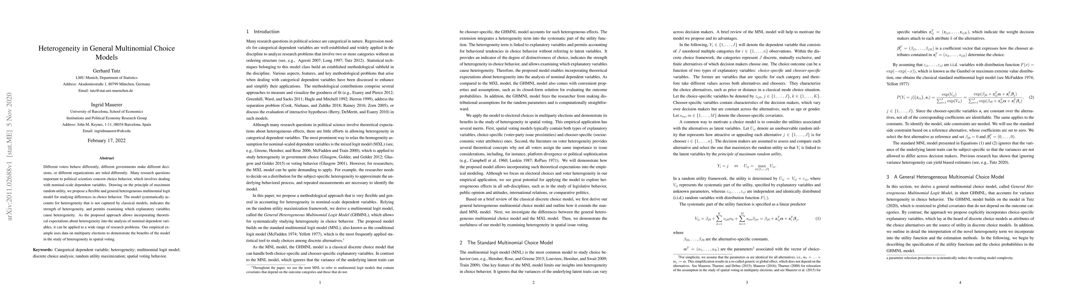 Different voters behave differently, different governments make different decisions, or different organizations are ruled differently. Many research questions important to political scientists concern choice behavior, which involves dealing with nominal-scale dependent variables. Drawing on the principle of maximum random utility, we propose a flexible and general heterogeneous multinomial logit model for studying differences in choice behavior. The model systematically accounts for heterogeneity that is not captured by classical models, indicates the strength of heterogeneity, and permits examining which explanatory variables cause heterogeneity. As the proposed approach allows incorporating theoretical expectations about heterogeneity into the analysis of nominal dependent variables, it can be applied to a wide range of research problems. Our empirical example uses data on multiparty elections to demonstrate the benefits of the model in the study of heterogeneity in spatial voting.
