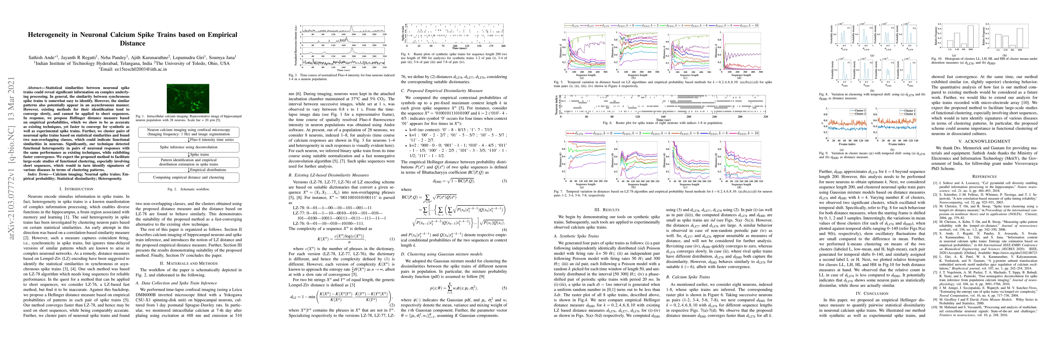 This paper proposes a novel Hellinger distance measure based on empirical probabilities to quickly identify statistical similarities between asynchronous neuronal spike trains, achieving faster convergence compared to existing methods. The technique successfully clusters spike trains into two non-overlapping classes, indicating functional heterogeneity, and is expected to enhance large-scale studies of neuronal functional clustering, particularly for short sequences.