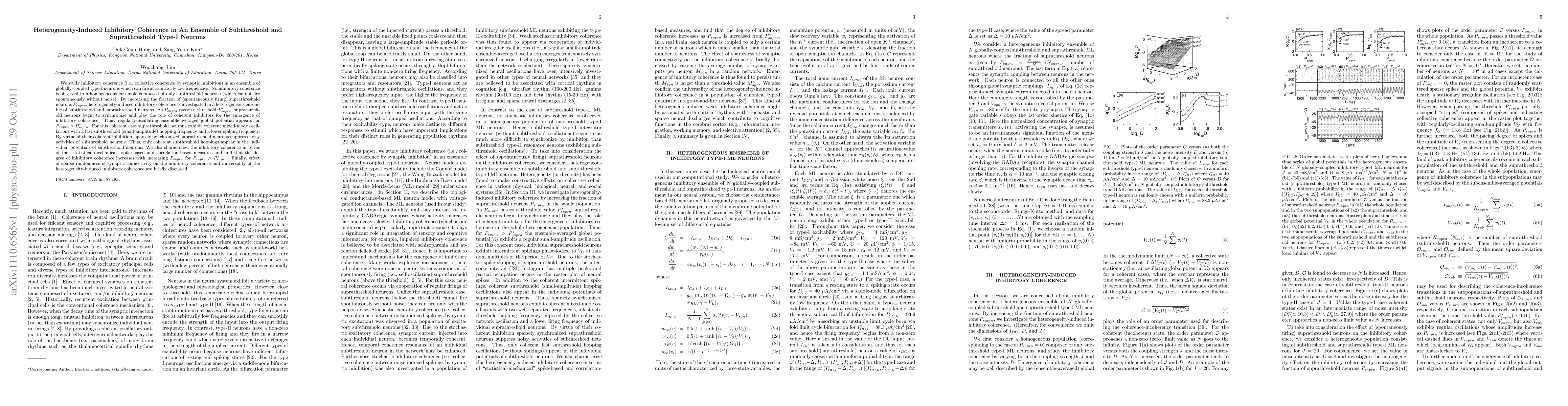 This paper investigates how heterogeneity in an ensemble of type-I neurons induces inhibitory coherence through the synchronization of suprathreshold neurons. It finds that inhibitory coherence emerges when a critical fraction of suprathreshold neurons synchronizes, suppressing the noisy activities of subthreshold neurons and leading to coherent subthreshold oscillations.
