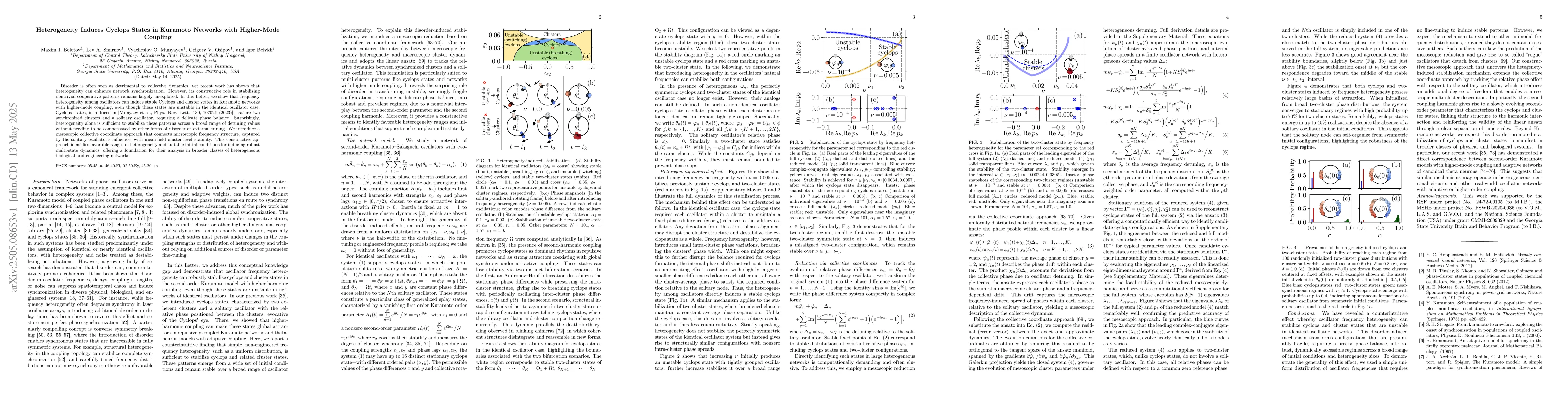 This work distinguishes itself by uncovering the constructive role of heterogeneity in stabilizing Cyclops and cluster states in Kuramoto networks with higher-mode coupling, which were unstable in the identical oscillator case, and by presenting a novel method to analyze these patterns.
