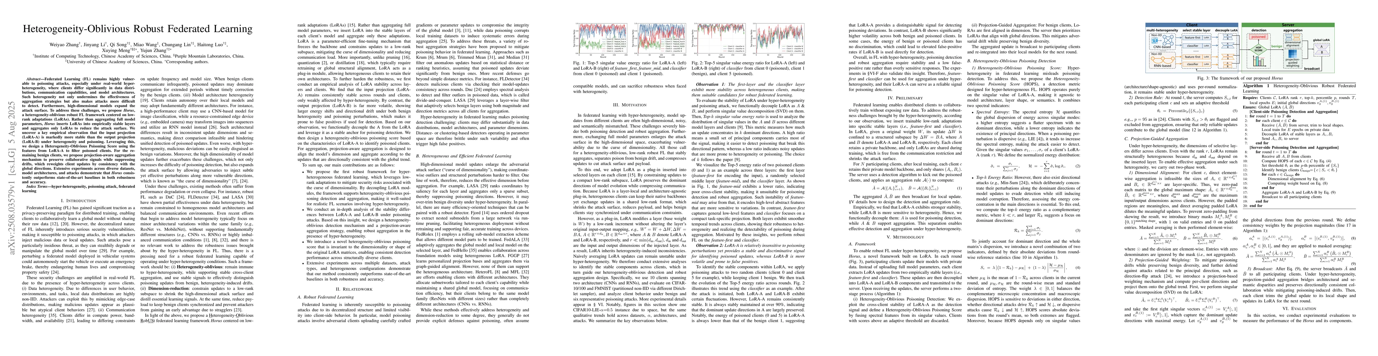 Federated Learning (FL) remains highly vulnerable to poisoning attacks, especially under real-world hyper-heterogeneity, where clients differ significantly in data distributions, communication capabilities, and model architectures. Such heterogeneity not only undermines the effectiveness of aggregation strategies but also makes attacks more difficult to detect. Furthermore, high-dimensional models expand the attack surface. To address these challenges, we propose Horus, a heterogeneity-oblivious robust FL framework centered on low-rank adaptations (LoRAs). Rather than aggregating full model parameters, Horus inserts LoRAs into empirically stable layers and aggregates only LoRAs to reduce the attack uncover a key empirical observation that the input projection (LoRA-A) is markedly more stable than the output projection (LoRA-B) under heterogeneity and poisoning. Leveraging this, we design a Heterogeneity-Oblivious Poisoning Score using the features from LoRA-A to filter poisoned clients. For the remaining benign clients, we propose projection-aware aggregation mechanism to preserve collaborative signals while suppressing drifts, which reweights client updates by consistency with the global directions. Extensive experiments across diverse datasets, model architectures, and attacks demonstrate that Horus consistently outperforms state-of-the-art baselines in both robustness and accuracy.