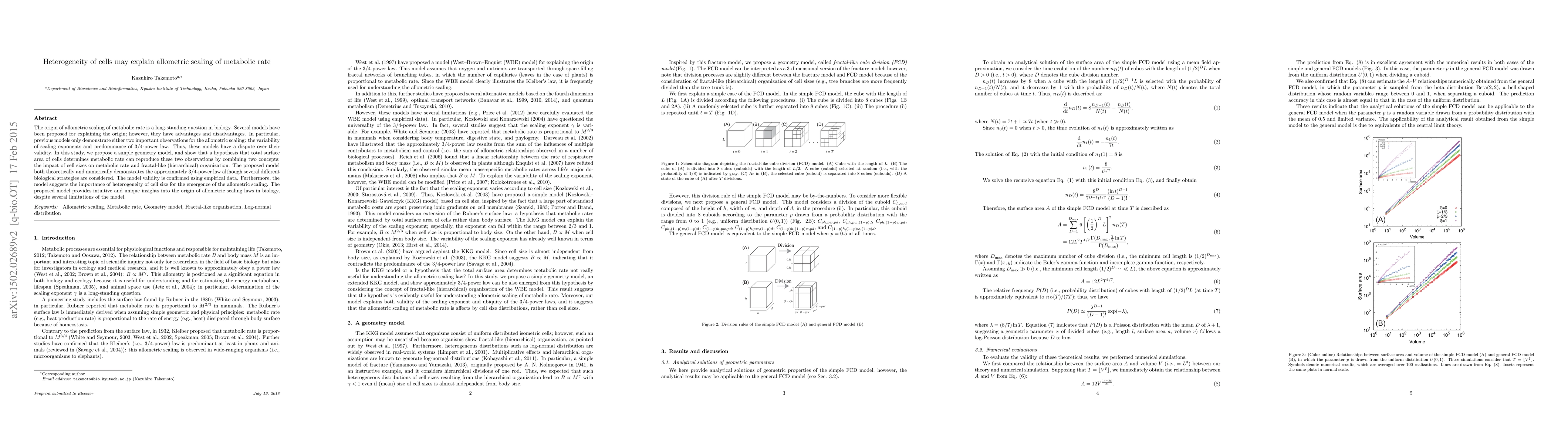 The origin of allometric scaling of metabolic rate is a long-standing question in biology. Several models have been proposed for explaining the origin; however, they have advantages and disadvantages. In particular, previous models only demonstrate either two important observations for the allometric scaling: the variability of scaling exponents and predominance of 3/4-power law. Thus, these models have a dispute over their validity. In this study, we propose a simple geometry model, and show that a hypothesis that total surface area of cells determines metabolic rate can reproduce these two observations by combining two concepts: the impact of cell sizes on metabolic rate and fractal-like (hierarchical) organization. The proposed model both theoretically and numerically demonstrates the approximately 3/4-power law although several different biological strategies are considered. The model validity is confirmed using empirical data. Furthermore, the model suggests the importance of heterogeneity of cell size for the emergence of the allometric scaling. The proposed model provides intuitive and unique insights into the origin of allometric scaling laws in biology, despite several limitations of the model.