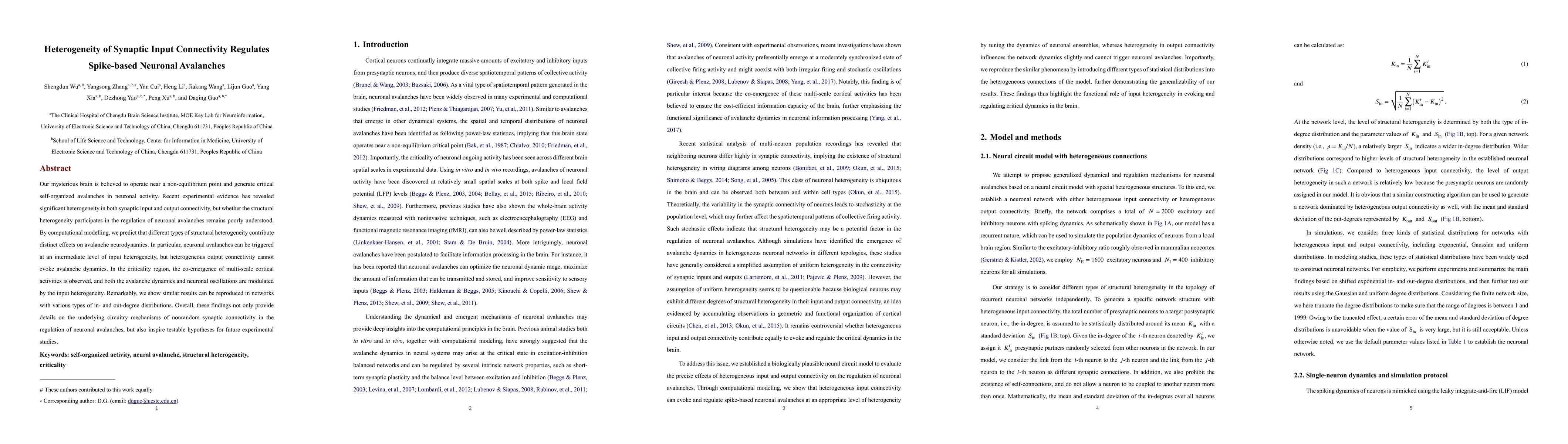 Our mysterious brain is believed to operate near a non-equilibrium point and generate critical self-organized avalanches in neuronal activity. Recent experimental evidence has revealed significant heterogeneity in both synaptic input and output connectivity, but whether the structural heterogeneity participates in the regulation of neuronal avalanches remains poorly understood. By computational modelling, we predict that different types of structural heterogeneity contribute distinct effects on avalanche neurodynamics. In particular, neuronal avalanches can be triggered at an intermediate level of input heterogeneity, but heterogeneous output connectivity cannot evoke avalanche dynamics. In the criticality region, the co-emergence of multi-scale cortical activities is observed, and both the avalanche dynamics and neuronal oscillations are modulated by the input heterogeneity. Remarkably, we show similar results can be reproduced in networks with various types of in- and out-degree distributions. Overall, these findings not only provide details on the underlying circuitry mechanisms of nonrandom synaptic connectivity in the regulation of neuronal avalanches, but also inspire testable hypotheses for future experimental studies.
