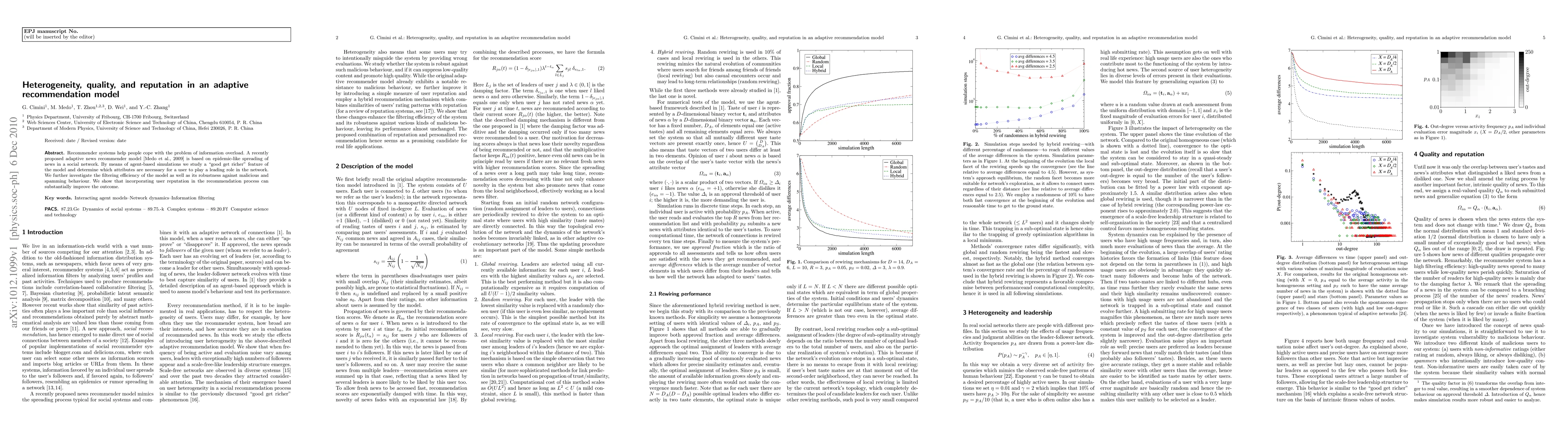 Recommender systems help people cope with the problem of information overload. A recently proposed adaptive news recommender model [Medo et al., 2009] is based on epidemic-like spreading of news in a social network. By means of agent-based simulations we study a "good get richer" feature of the model and determine which attributes are necessary for a user to play a leading role in the network. We further investigate the filtering efficiency of the model as well as its robustness against malicious and spamming behaviour. We show that incorporating user reputation in the recommendation process can substantially improve the outcome.