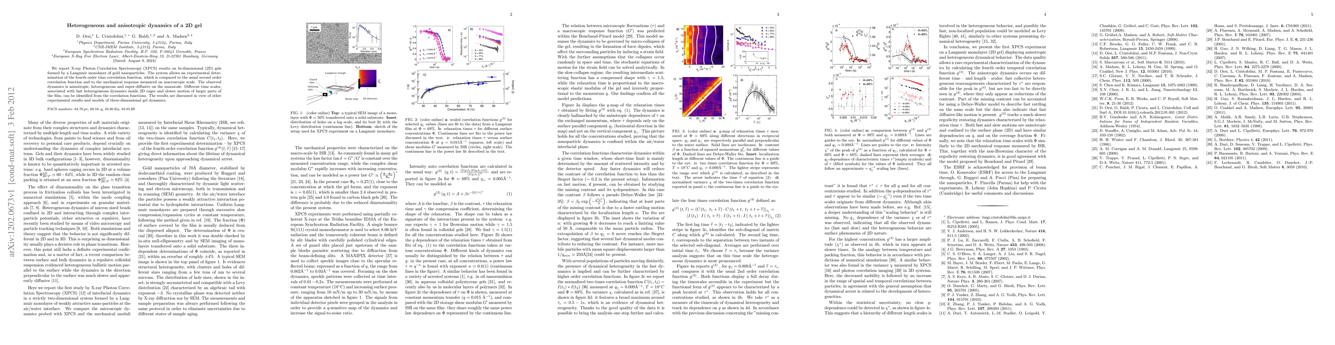 This study uses X-ray Photon Correlation Spectroscopy to investigate the dynamics of a 2D gel formed by gold nanoparticles, revealing anisotropic, heterogeneous, and super-diffusive nanoscale behavior. The fourth-order time correlation function is compared to second-order functions and macroscopic mechanical responses, identifying distinct time scales for internal cage dynamics and larger film motions.