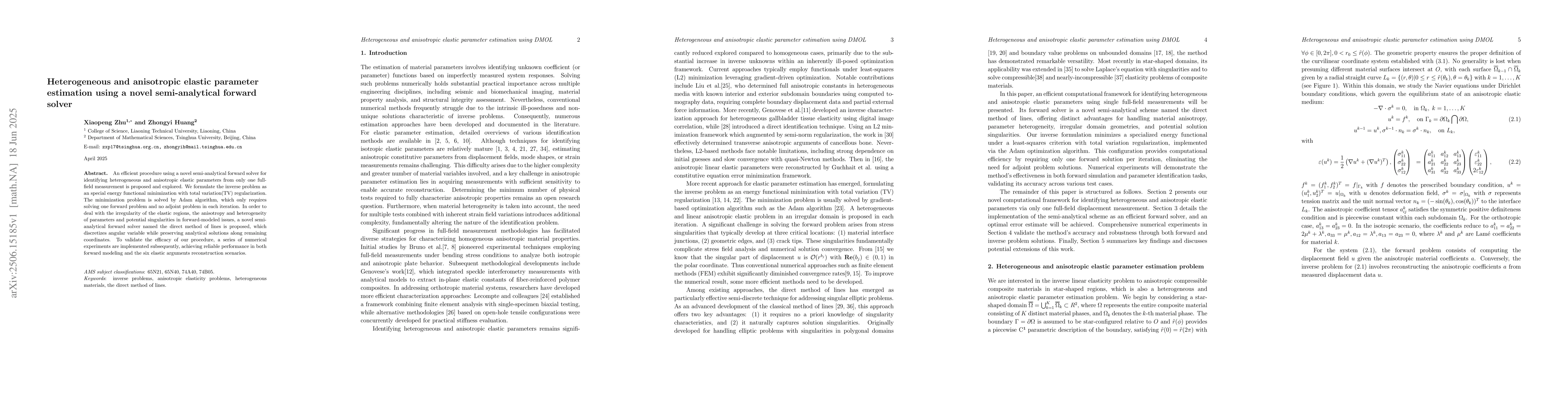 An efficient procedure using a novel semi-analytical forward solver for identifying heterogeneous and anisotropic elastic parameters from only one full-field measurement is proposed and explored. We formulate the inverse problem as an special energy functional minimization with total variation(TV) regularization. The minimization problem is solved by Adam algorithm, which only requires solving one forward problem and no adjoint problem in each iteration. In order to deal with the irregularity of the elastic regions, the anisotropy and heterogeneity of parameters and potential singularities in forward-modeled issues, a novel semi-analytical forward solver named the direct method of lines is proposed, which discretizes angular variable while preserving analytical solutions along remaining coordinates. To validate the efficacy of our procedure, a series of numerical experiments are implemented subsequently, achieving reliable performance in both forward modeling and the six elastic arguments reconstruction scenarios.