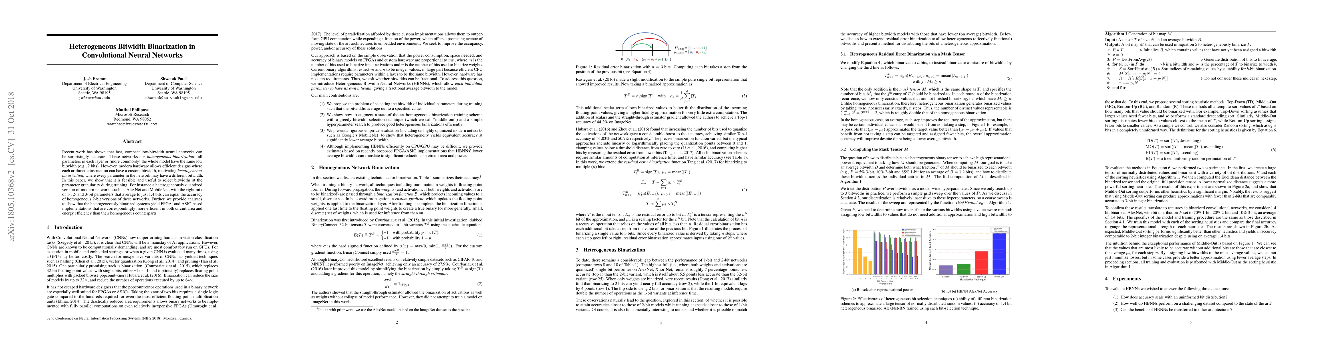 Recent work has shown that fast, compact low-bitwidth neural networks can be surprisingly accurate. These networks use homogeneous binarization: all parameters in each layer or (more commonly) the whole model have the same low bitwidth (e.g., 2 bits). However, modern hardware allows efficient designs where each arithmetic instruction can have a custom bitwidth, motivating heterogeneous binarization, where every parameter in the network may have a different bitwidth. In this paper, we show that it is feasible and useful to select bitwidths at the parameter granularity during training. For instance a heterogeneously quantized version of modern networks such as AlexNet and MobileNet, with the right mix of 1-, 2- and 3-bit parameters that average to just 1.4 bits can equal the accuracy of homogeneous 2-bit versions of these networks. Further, we provide analyses to show that the heterogeneously binarized systems yield FPGA- and ASIC-based implementations that are correspondingly more efficient in both circuit area and energy efficiency than their homogeneous counterparts.