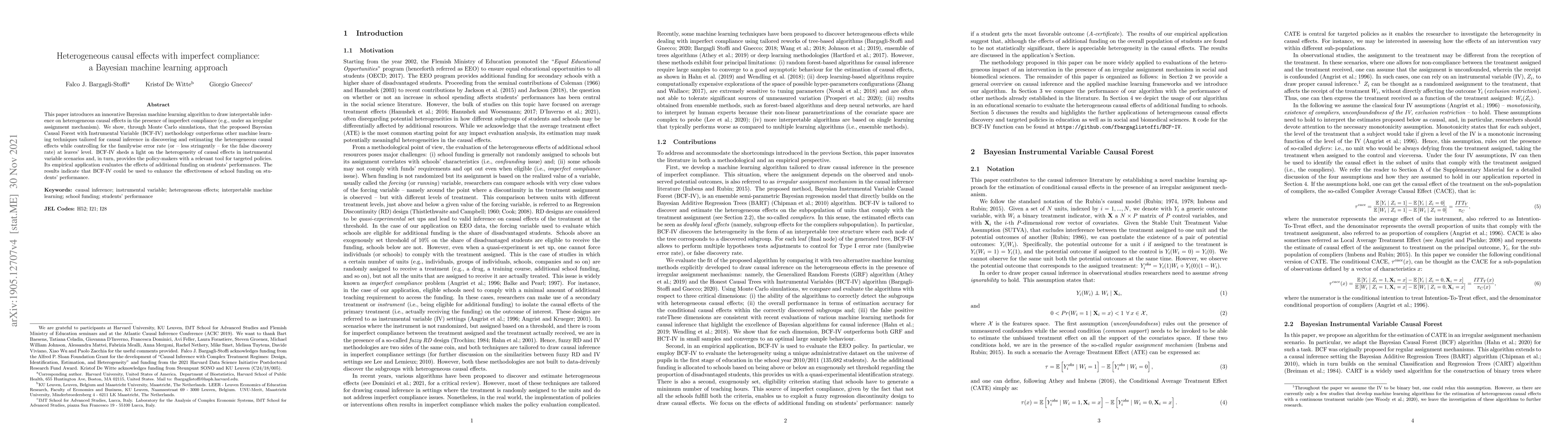 This paper introduces an innovative Bayesian machine learning algorithm to draw interpretable inference on heterogeneous causal effects in the presence of imperfect compliance (e.g., under an irregular assignment mechanism). We show, through Monte Carlo simulations, that the proposed Bayesian Causal Forest with Instrumental Variable (BCF-IV) methodology outperforms other machine learning techniques tailored for causal inference in discovering and estimating the heterogeneous causal effects while controlling for the familywise error rate (or - less stringently - for the false discovery rate) at leaves' level. BCF-IV sheds a light on the heterogeneity of causal effects in instrumental variable scenarios and, in turn, provides the policy-makers with a relevant tool for targeted policies. Its empirical application evaluates the effects of additional funding on students' performances. The results indicate that BCF-IV could be used to enhance the effectiveness of school funding on students' performance.