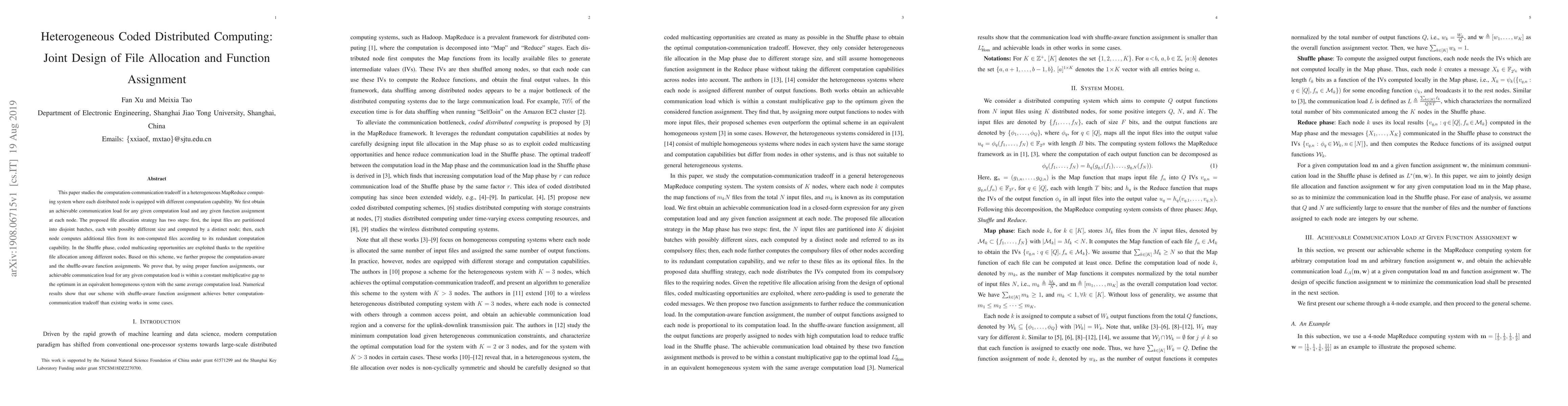 This paper proposes a heterogeneous coded distributed computing framework optimizing file allocation and function assignment in a MapReduce system with varying node capacities. The strategy achieves near-optimal communication load relative to computation load, demonstrating superior computation-communication tradeoff compared to existing methods.