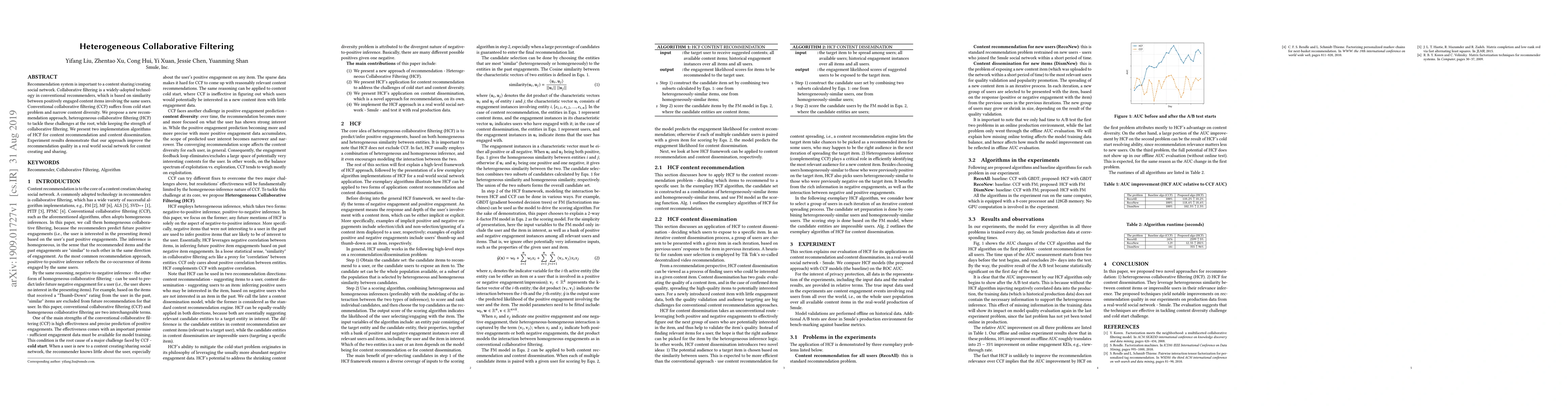The paper proposes heterogeneous collaborative filtering (HCF) to address cold start issues and limited content diversity in traditional collaborative filtering. It presents two HCF algorithms for content recommendation and dissemination, which enhance recommendation quality in real-world social networks.