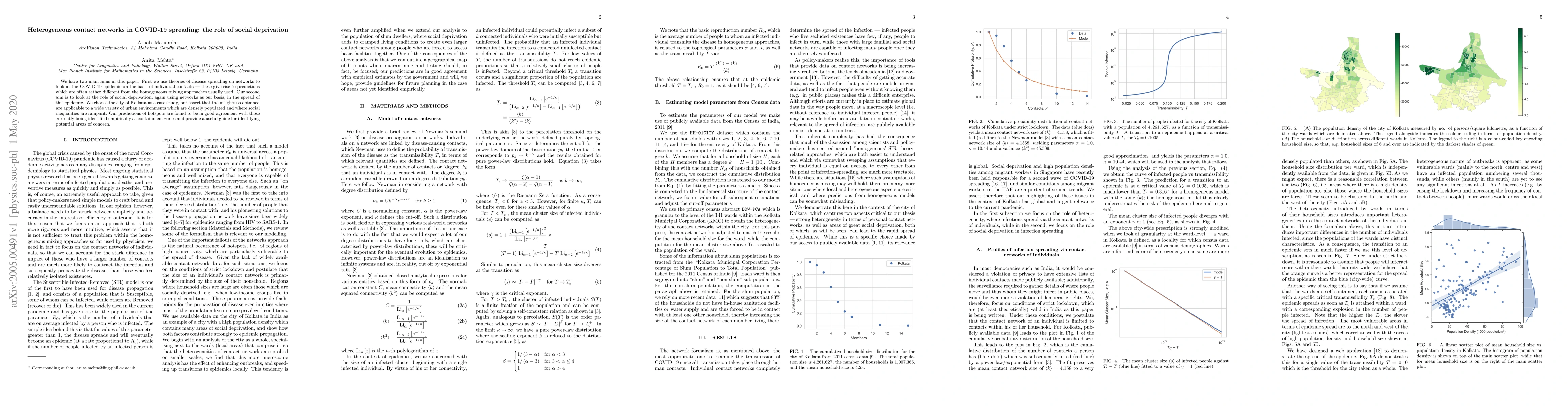 We have two main aims in this paper. First we use theories of disease spreading on networks to look at the COVID-19 epidemic on the basis of individual contacts -- these give rise to predictions which are often rather different from the homogeneous mixing approaches usually used. Our second aim is to look at the role of social deprivation, again using networks as our basis, in the spread of this epidemic. We choose the city of Kolkata as a case study, but assert that the insights so obtained are applicable to a wide variety of urban environments which are densely populated and where social inequalities are rampant. Our predictions of hotspots are found to be in good agreement with those currently being identifed empirically as containment zones and provide a useful guide for identifying potential areas of concern.