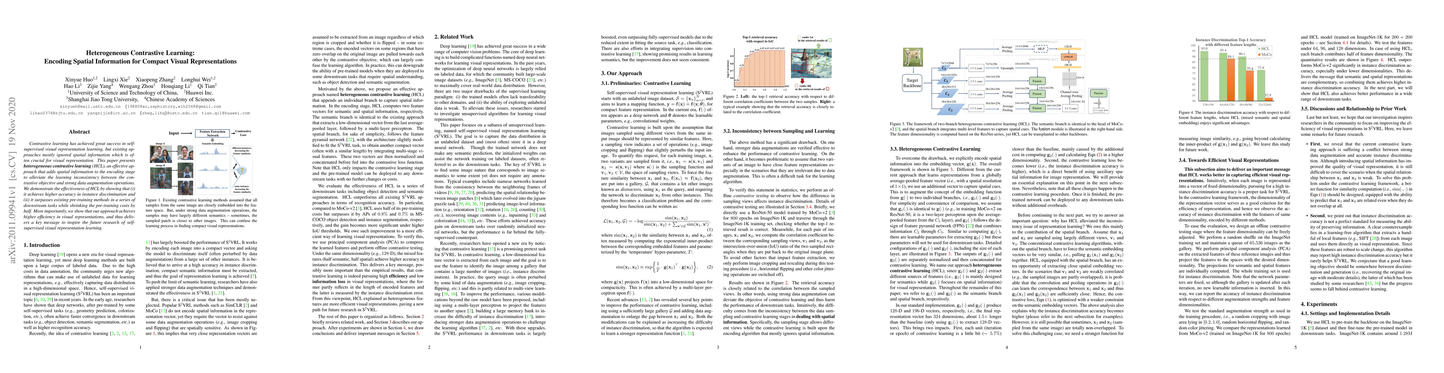This paper introduces heterogeneous contrastive learning (HCL) to incorporate spatial information during encoding, improving visual representation learning. HCL enhances instance discrimination accuracy and outperforms existing pre-training methods, while reducing pre-training costs by half and achieving more efficient visual representations.