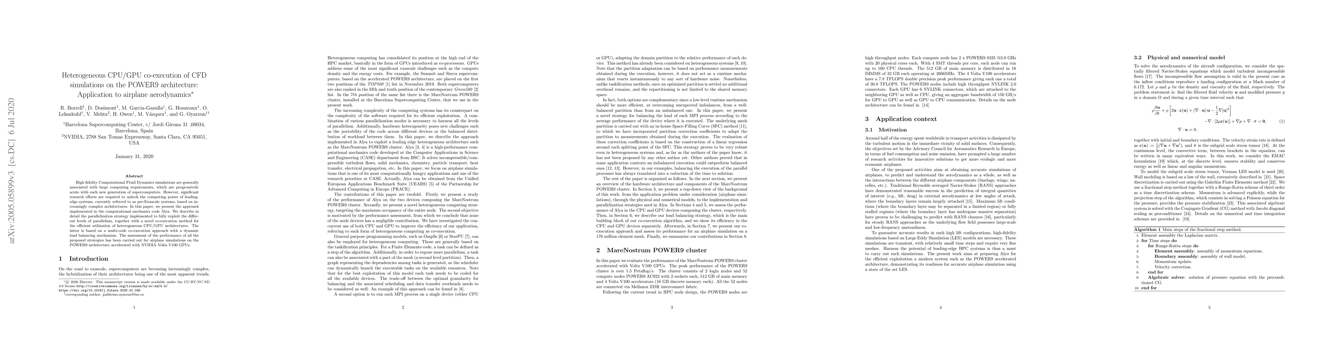 This paper details a parallelization strategy for high fidelity CFD simulations on the POWER9 architecture, focusing on efficient CPU/GPU co-execution using a dynamic load balancing mechanism. The approach is demonstrated through airplane aerodynamics simulations, showcasing significant performance improvements on pre-Exascale systems.