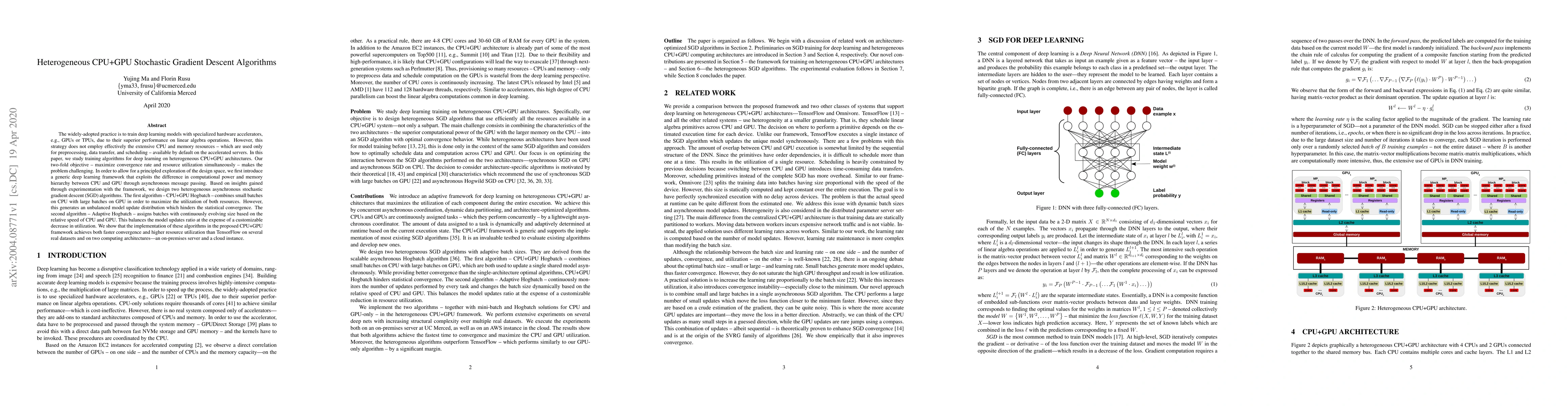 This paper proposes two heterogeneous CPU+GPU asynchronous SGD algorithms to optimize both convergence rate and resource utilization in deep learning training. The first algorithm, CPU+GPU Hogbatch, combines small CPU batches with large GPU batches but faces convergence issues due to unbalanced updates. The second, Adaptive Hogbatch, dynamically adjusts batch sizes to balance updates, achieving faster convergence and higher resource utilization compared to TensorFlow on various datasets and architectures.