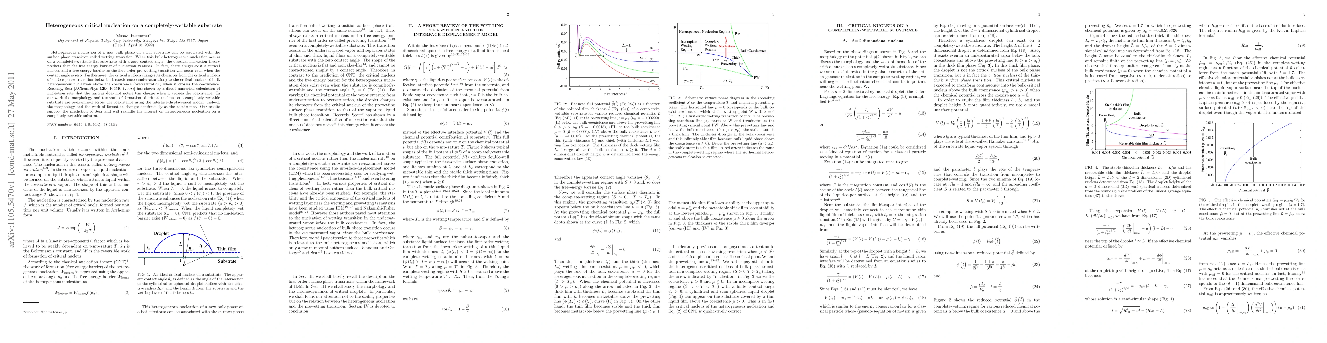 This paper explores the heterogeneous nucleation of a new bulk phase on a completely-wettable substrate, demonstrating that despite a zero contact angle, a critical nucleus and a free energy barrier exist due to a first-order pre-wetting transition. The study confirms Sear's findings that the nucleus's morphology and formation work change continuously across the coexistence point, supporting the theory of continuous transition in nucleation.