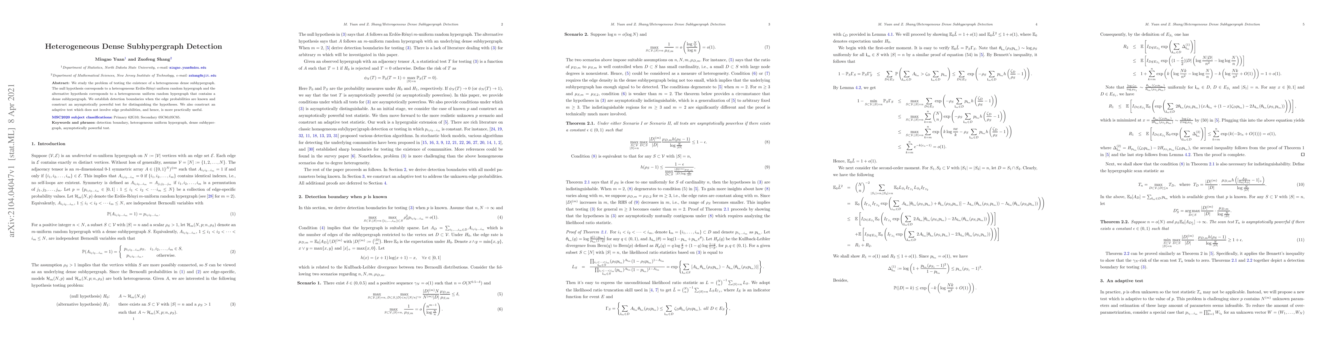 We study the problem of testing the existence of a heterogeneous dense subhypergraph. The null hypothesis corresponds to a heterogeneous Erd\"{o}s-R\'{e}nyi uniform random hypergraph and the alternative hypothesis corresponds to a heterogeneous uniform random hypergraph that contains a dense subhypergraph. We establish detection boundaries when the edge probabilities are known and construct an asymptotically powerful test for distinguishing the hypotheses. We also construct an adaptive test which does not involve edge probabilities, and hence, is more practically useful.