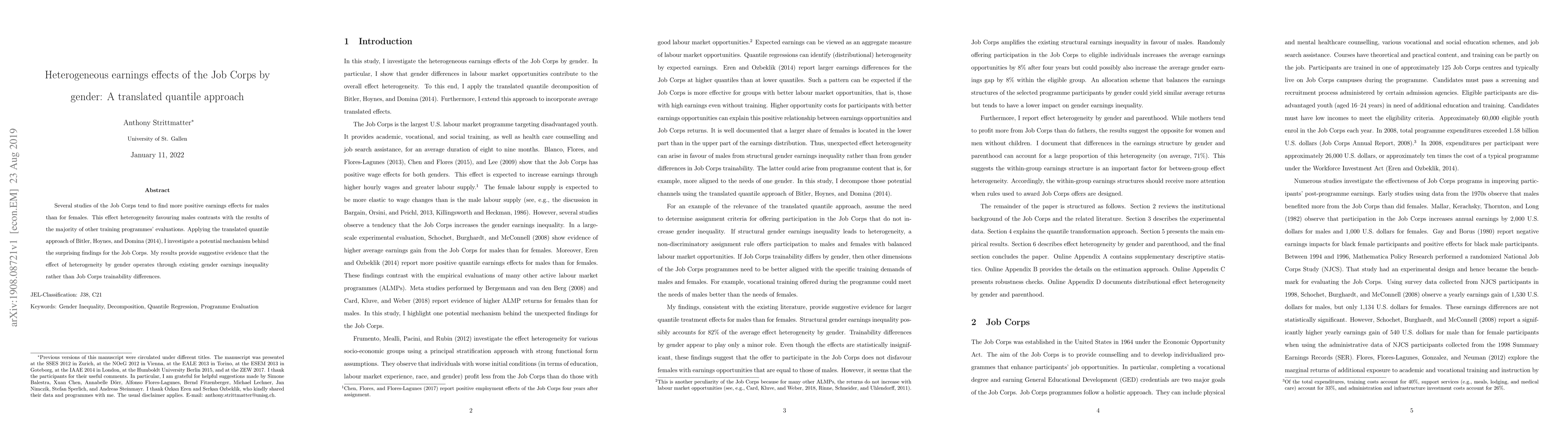 Summary: The study examines the earnings effects of Job Corps by gender using a translated quantile approach, finding that males benefit more than females, contrary to other training programs. The results suggest this gender earnings heterogeneity is driven by pre-existing gender earnings inequality rather than differences in trainability.