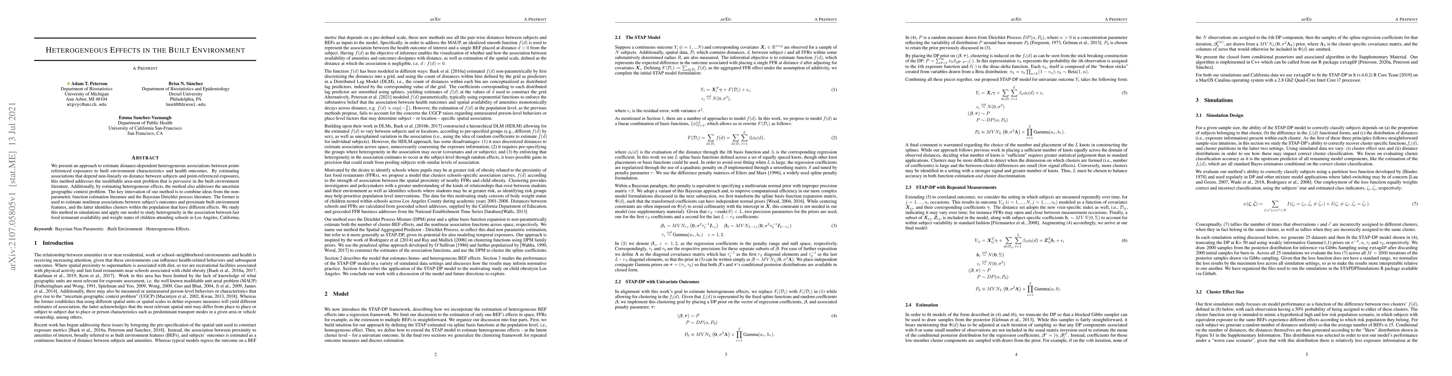 This paper introduces a novel method for estimating distance-dependent, heterogeneous associations between built environment features and health outcomes, addressing both the modifiable area-unit problem and the uncertain geographic context problem. The method combines non-parametric function estimation with Bayesian Dirichlet process to identify clusters with different effects, demonstrated through a study on the relationship between fast food availability and children's weight status in Los Angeles.