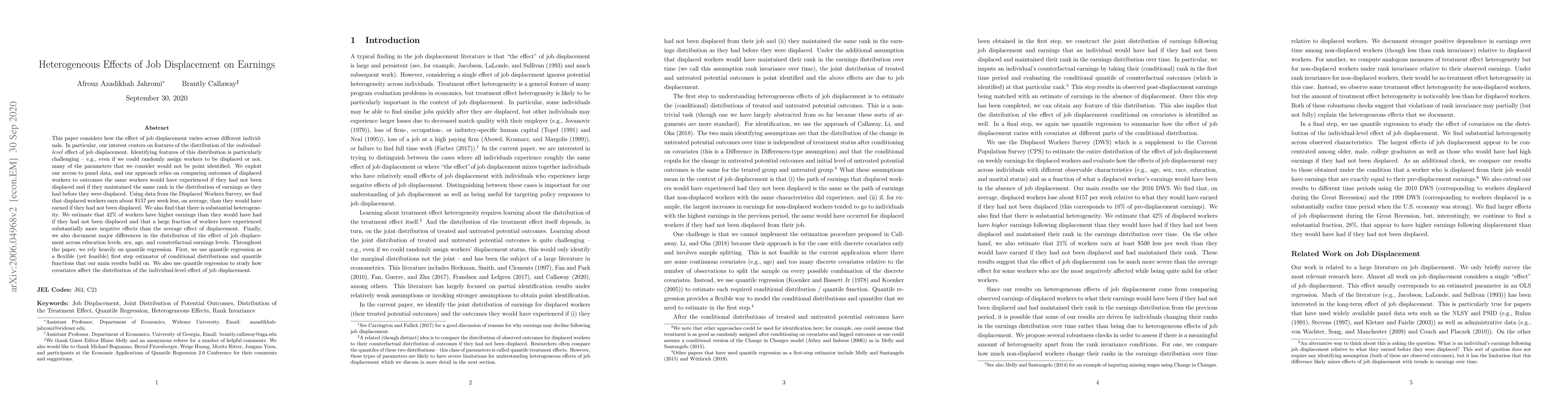 This paper considers how the effect of job displacement varies across different individuals. In particular, our interest centers on features of the distribution of the individual-level effect of job displacement. Identifying features of this distribution is particularly challenging -- e.g., even if we could randomly assign workers to be displaced or not, many of the parameters that we consider would not be point identified. We exploit our access to panel data, and our approach relies on comparing outcomes of displaced workers to outcomes the same workers would have experienced if they had not been displaced and if they maintained the same rank in the distribution of earnings as they had before they were displaced. Using data from the Displaced Workers Survey, we find that displaced workers earn about $157 per week less, on average, than they would have earned if they had not been displaced. We also find that there is substantial heterogeneity. We estimate that 42% of workers have higher earnings than they would have had if they had not been displaced and that a large fraction of workers have experienced substantially more negative effects than the average effect of displacement. Finally, we also document major differences in the distribution of the effect of job displacement across education levels, sex, age, and counterfactual earnings levels. Throughout the paper, we rely heavily on quantile regression. First, we use quantile regression as a flexible (yet feasible) first step estimator of conditional distributions and quantile functions that our main results build on. We also use quantile regression to study how covariates affect the distribution of the individual-level effect of job displacement.