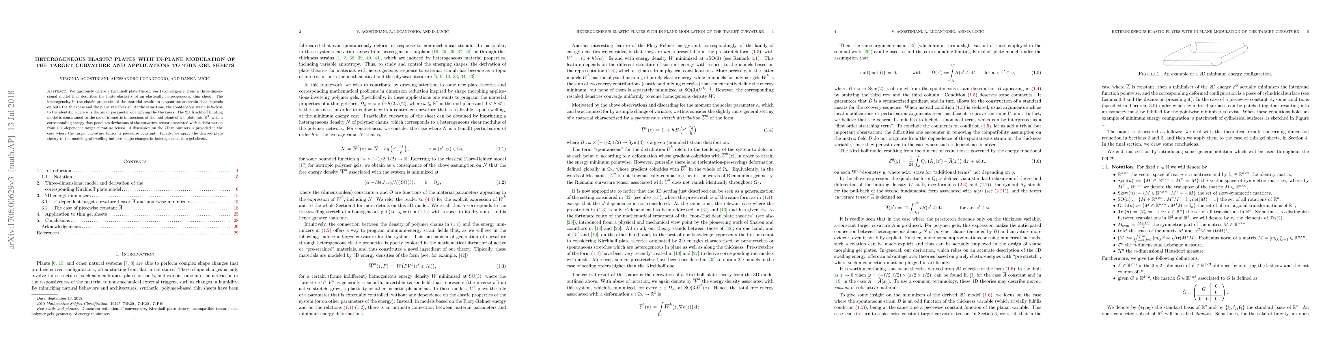 This paper derives a Kirchhoff plate theory from a 3D finite elasticity model for elastically heterogeneous thin sheets, focusing on in-plane modulation of curvature. It applies the theory to model swelling-induced shape changes in thin gel sheets.