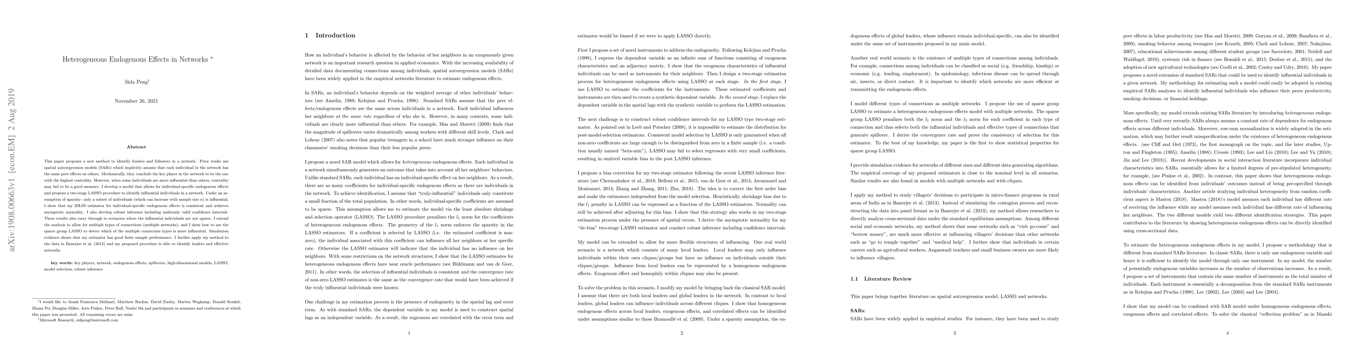 This paper proposes a new method to identify leaders and followers in a network. Prior works use spatial autoregression models (SARs) which implicitly assume that each individual in the network has the same peer effects on others. Mechanically, they conclude the key player in the network to be the one with the highest centrality. However, when some individuals are more influential than others, centrality may fail to be a good measure. I develop a model that allows for individual-specific endogenous effects and propose a two-stage LASSO procedure to identify influential individuals in a network. Under an assumption of sparsity: only a subset of individuals (which can increase with sample size n) is influential, I show that my 2SLSS estimator for individual-specific endogenous effects is consistent and achieves asymptotic normality. I also develop robust inference including uniformly valid confidence intervals. These results also carry through to scenarios where the influential individuals are not sparse. I extend the analysis to allow for multiple types of connections (multiple networks), and I show how to use the sparse group LASSO to detect which of the multiple connection types is more influential. Simulation evidence shows that my estimator has good finite sample performance. I further apply my method to the data in Banerjee et al. (2013) and my proposed procedure is able to identify leaders and effective networks.