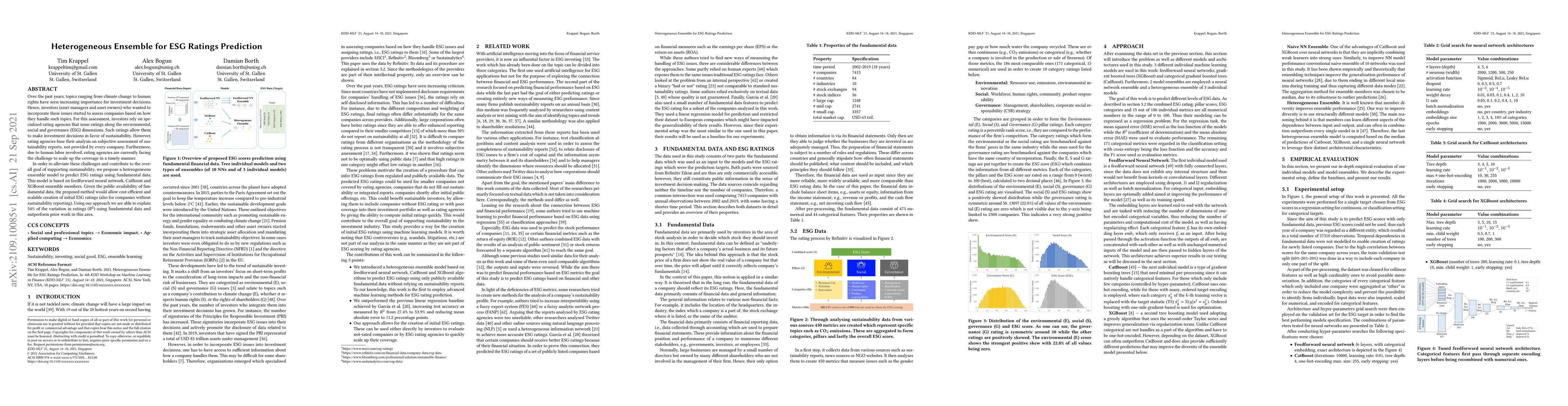 Over the past years, topics ranging from climate change to human rights have seen increasing importance for investment decisions. Hence, investors (asset managers and asset owners) who wanted to incorporate these issues started to assess companies based on how they handle such topics. For this assessment, investors rely on specialized rating agencies that issue ratings along the environmental, social and governance (ESG) dimensions. Such ratings allow them to make investment decisions in favor of sustainability. However, rating agencies base their analysis on subjective assessment of sustainability reports, not provided by every company. Furthermore, due to human labor involved, rating agencies are currently facing the challenge to scale up the coverage in a timely manner. In order to alleviate these challenges and contribute to the overall goal of supporting sustainability, we propose a heterogeneous ensemble model to predict ESG ratings using fundamental data. This model is based on feedforward neural network, CatBoost and XGBoost ensemble members. Given the public availability of fundamental data, the proposed method would allow cost-efficient and scalable creation of initial ESG ratings (also for companies without sustainability reporting). Using our approach we are able to explain 54% of the variation in ratings R2 using fundamental data and outperform prior work in this area.