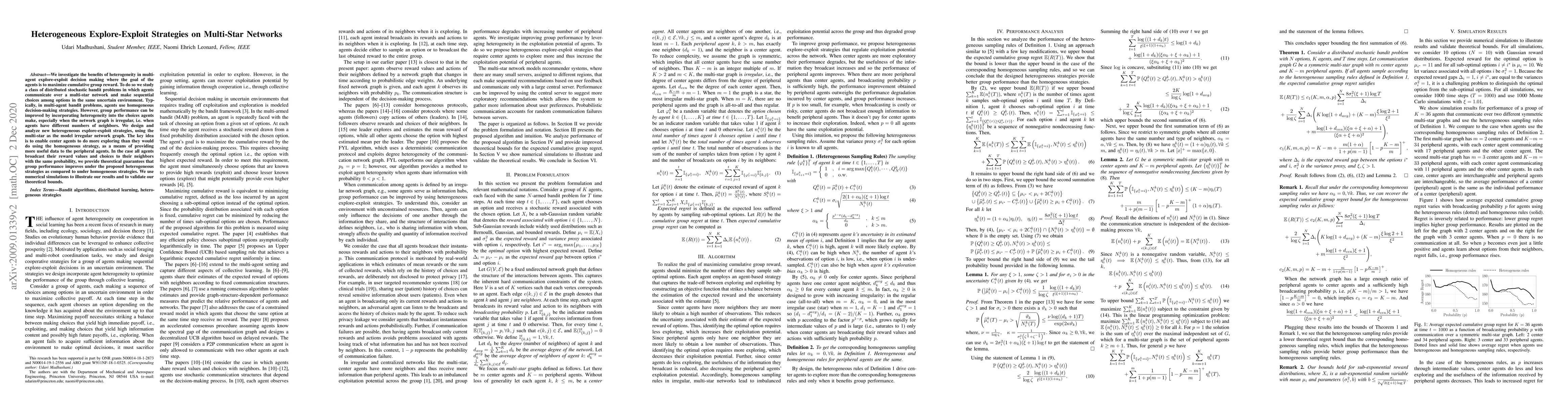 This paper explores heterogeneous explore-exploit strategies in multi-agent systems on multi-star networks, demonstrating that incorporating heterogeneity can improve group performance compared to homogeneous strategies. The proposed strategies allow central agents to explore more, benefiting peripheral agents and enhancing overall cumulative rewards.