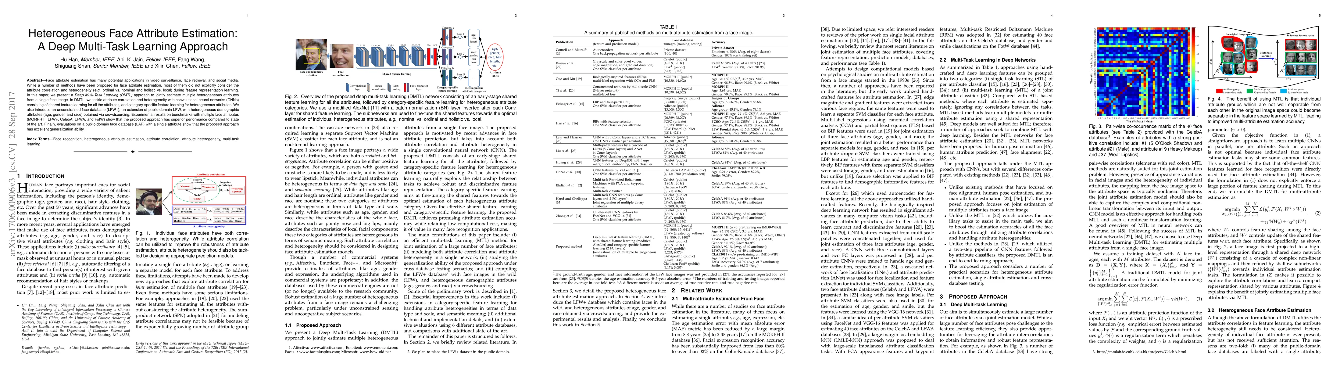 This paper proposes a Deep Multi-Task Learning (DMTL) approach to jointly estimate multiple heterogeneous face attributes, addressing attribute correlation and heterogeneity through convolutional neural networks with shared and category-specific feature learning. The method outperforms state-of-the-art on various benchmarks and demonstrates strong generalization on a new unconstrained face database.