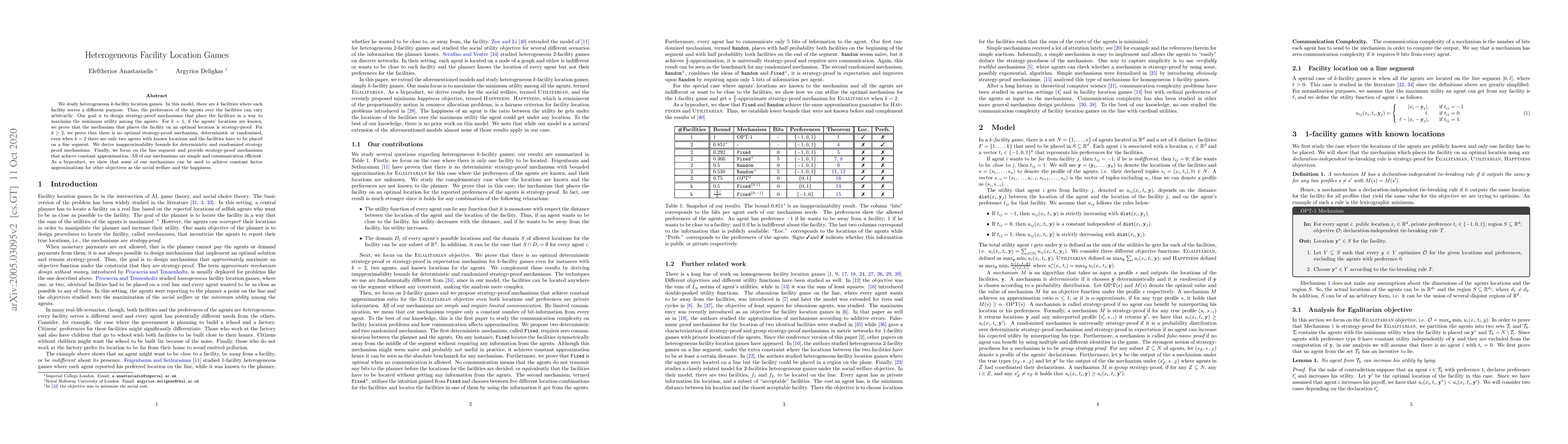 We study heterogeneous $k$-facility location games. In this model there are $k$ facilities where each facility serves a different purpose. Thus, the preferences of the agents over the facilities can vary arbitrarily. Our goal is to design strategy proof mechanisms that place the facilities in a way to maximize the minimum utility among the agents. For $k=1$, if the agents' locations are known, we prove that the mechanism that places the facility on an optimal location is strategy proof. For $k \geq 2$, we prove that there is no optimal strategy proof mechanism, deterministic or randomized, even when $k=2$ there are only two agents with known locations, and the facilities have to be placed on a line segment. We derive inapproximability bounds for deterministic and randomized strategy proof mechanisms. Finally, we focus on the line segment and provide strategy proof mechanisms that achieve constant approximation. All of our mechanisms are simple and communication efficient. As a byproduct we show that some of our mechanisms can be used to achieve constant factor approximations for other objectives as the social welfare and the happiness.