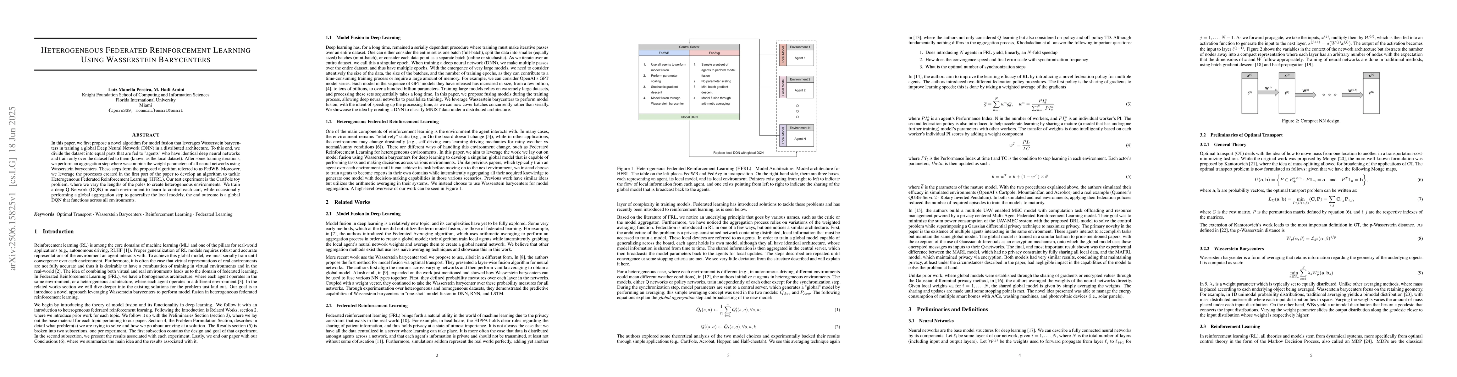 In this paper, we first propose a novel algorithm for model fusion that leverages Wasserstein barycenters in training a global Deep Neural Network (DNN) in a distributed architecture. To this end, we divide the dataset into equal parts that are fed to "agents" who have identical deep neural networks and train only over the dataset fed to them (known as the local dataset). After some training iterations, we perform an aggregation step where we combine the weight parameters of all neural networks using Wasserstein barycenters. These steps form the proposed algorithm referred to as FedWB. Moreover, we leverage the processes created in the first part of the paper to develop an algorithm to tackle Heterogeneous Federated Reinforcement Learning (HFRL). Our test experiment is the CartPole toy problem, where we vary the lengths of the poles to create heterogeneous environments. We train a deep Q-Network (DQN) in each environment to learn to control each cart, while occasionally performing a global aggregation step to generalize the local models; the end outcome is a global DQN that functions across all environments.