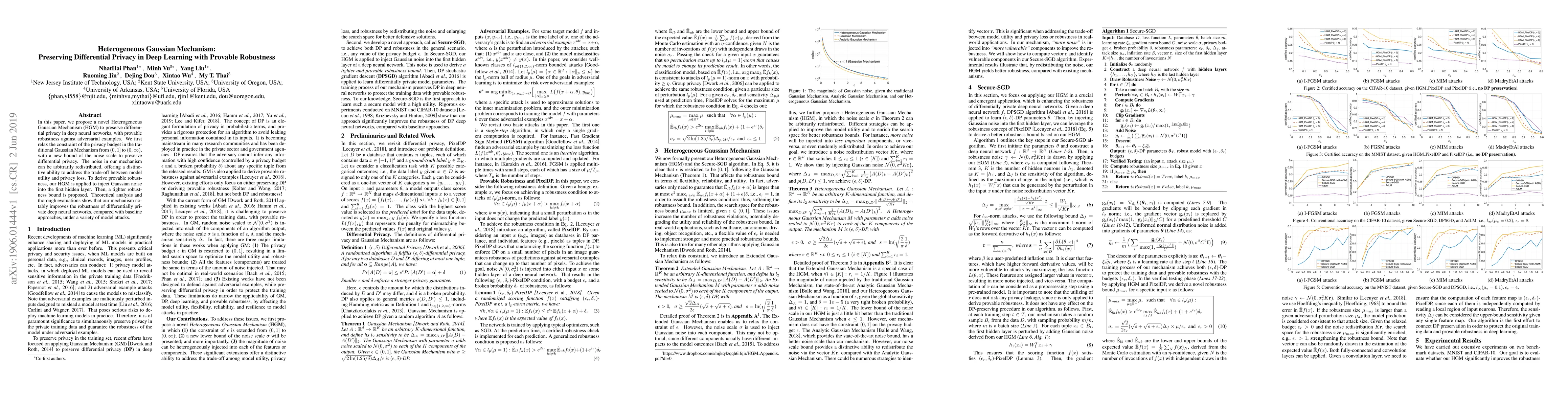 This paper introduces a Heterogeneous Gaussian Mechanism (HGM) to enhance differential privacy in deep learning, offering robust protection against adversarial attacks. The HGM relaxes the privacy budget constraint and redistributes noise to balance model utility and privacy, while providing a tighter robustness bound through Gaussian noise injection in the first hidden layer.