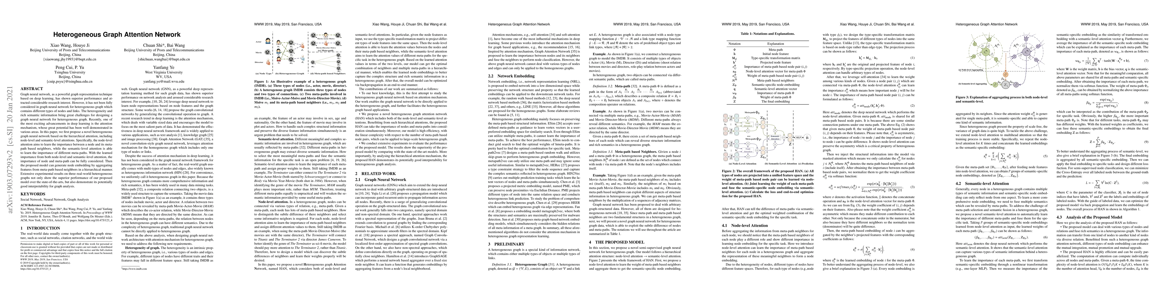 This paper proposes a novel heterogeneous graph neural network utilizing hierarchical attention mechanisms, including node-level and semantic-level attentions, to effectively learn the importance of nodes and meta-paths in heterogeneous graphs. The model demonstrates superior performance and interpretability in real-world graph analysis tasks.