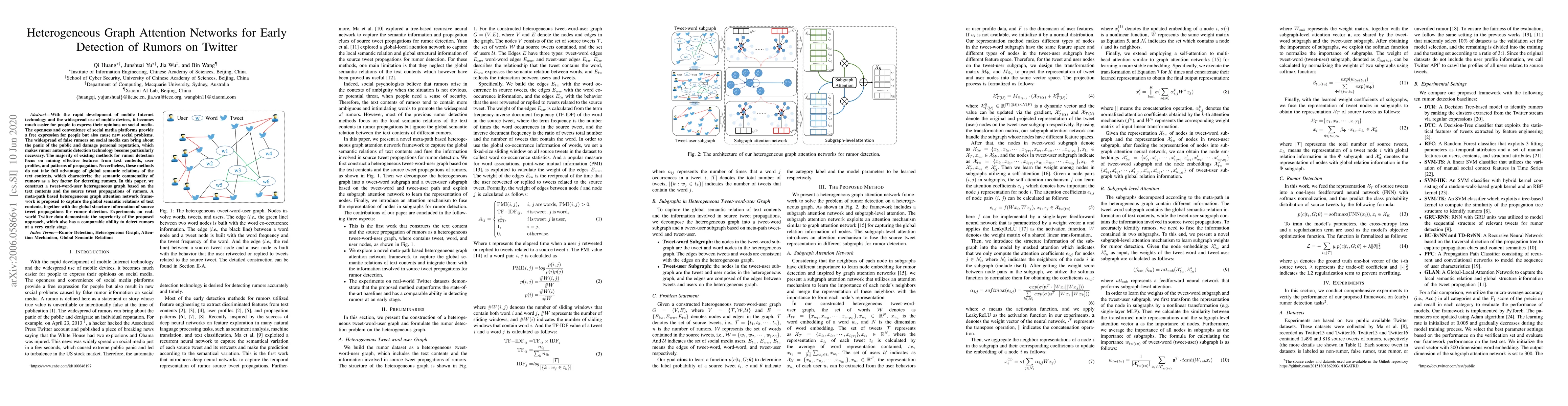 This paper proposes a heterogeneous graph attention network to detect rumors on Twitter by leveraging global semantic relations of text contents and the global structure of tweet propagations. Experiments show the effectiveness of the method in early rumor detection.