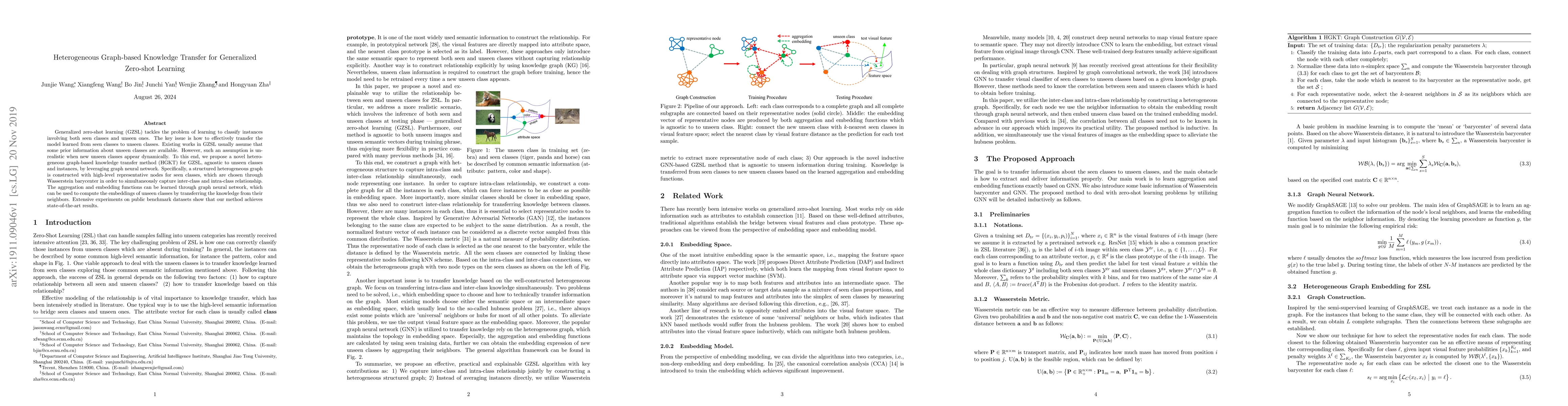 Generalized zero-shot learning (GZSL) tackles the problem of learning to classify instances involving both seen classes and unseen ones. The key issue is how to effectively transfer the model learned from seen classes to unseen classes. Existing works in GZSL usually assume that some prior information about unseen classes are available. However, such an assumption is unrealistic when new unseen classes appear dynamically. To this end, we propose a novel heterogeneous graph-based knowledge transfer method (HGKT) for GZSL, agnostic to unseen classes and instances, by leveraging graph neural network. Specifically, a structured heterogeneous graph is constructed with high-level representative nodes for seen classes, which are chosen through Wasserstein barycenter in order to simultaneously capture inter-class and intra-class relationship. The aggregation and embedding functions can be learned through graph neural network, which can be used to compute the embeddings of unseen classes by transferring the knowledge from their neighbors. Extensive experiments on public benchmark datasets show that our method achieves state-of-the-art results.