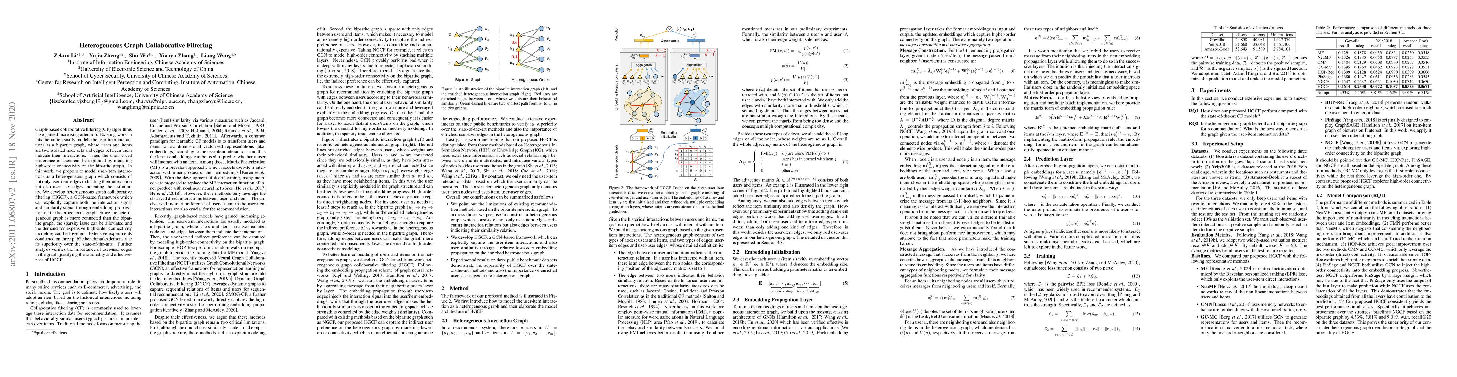 This paper proposes a heterogeneous graph collaborative filtering (HGCF) framework to model user-item interactions as a heterogeneous graph, incorporating user-user similarity. HGCF leverages GCN for embedding propagation, alleviating sparsity and reducing the need for high-order connectivity modeling, outperforming existing bipartite graph-based methods.
