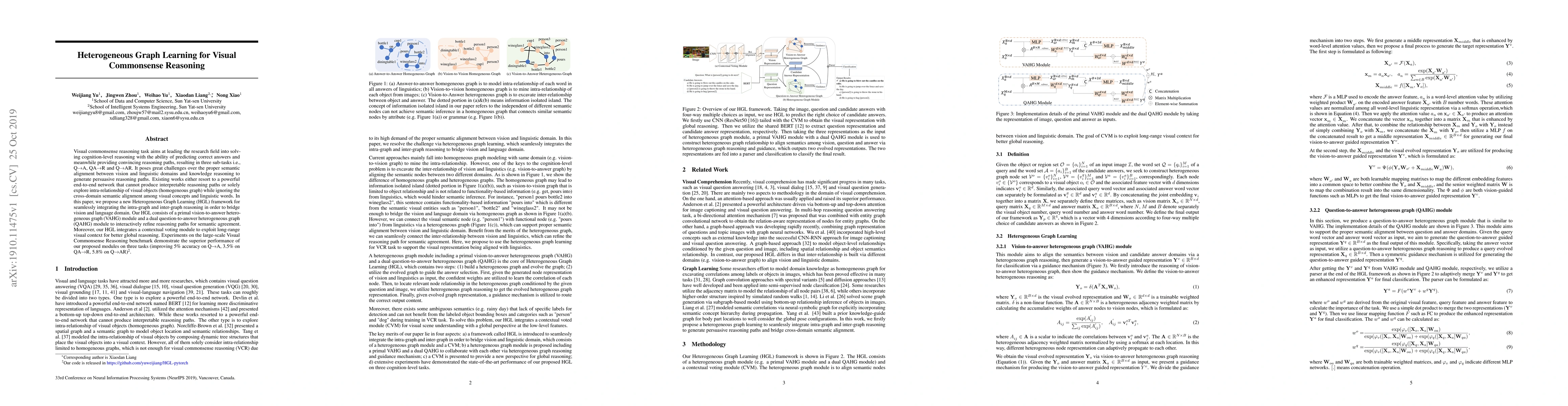 This paper proposes a Heterogeneous Graph Learning (HGL) framework to enhance visual commonsense reasoning by integrating intra-graph and inter-graph reasoning to bridge vision and language domains. The HGL framework includes VAHG and QAHG modules for refining reasoning paths and a contextual voting module for improved global reasoning, achieving notable accuracy improvements on three sub-tasks.